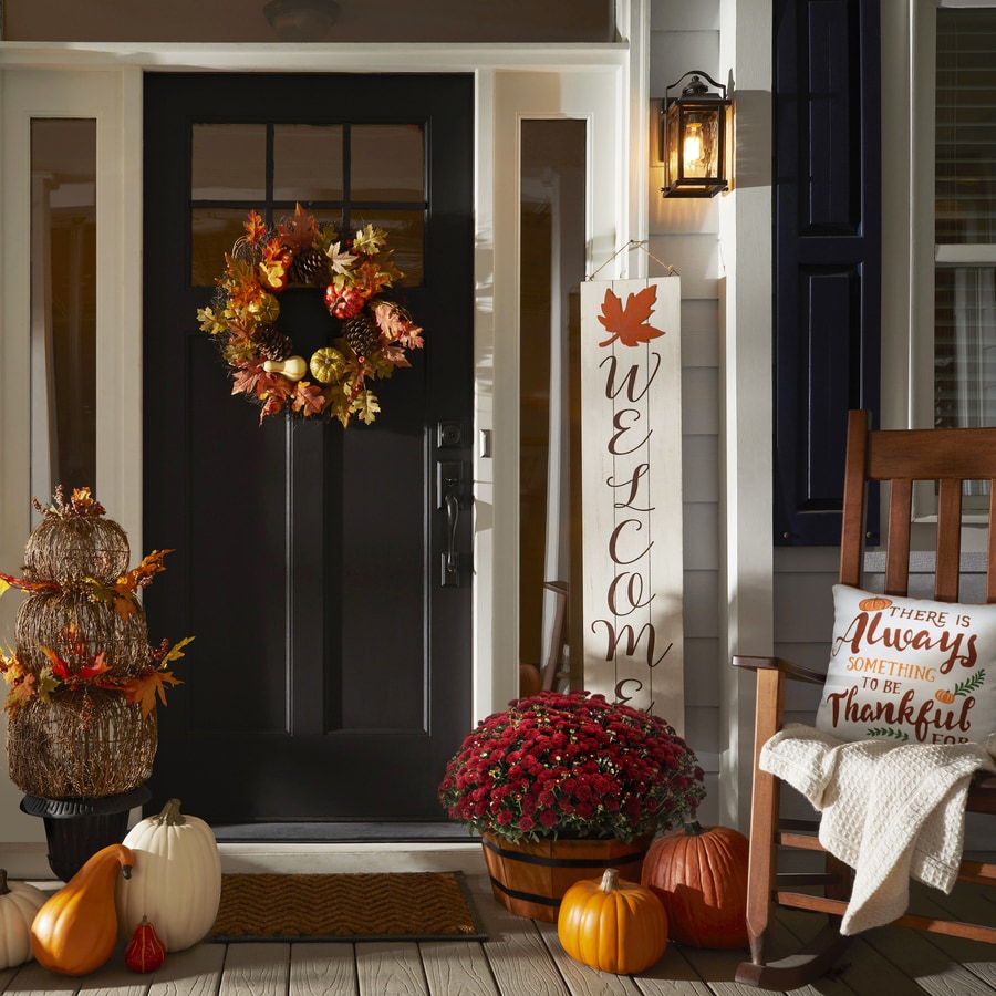 Let's give thanks this year for these autumn decorations. Beautiful fall colors and elegant finishes make these outdoor fall decorations a great way to decorate your home. A rustic white wooden welcome sign, fall wreath and accent pillow remind us there's always something to be thankful for this season. Create a warm welcome with the Give Thanks Collection by Holiday Living.