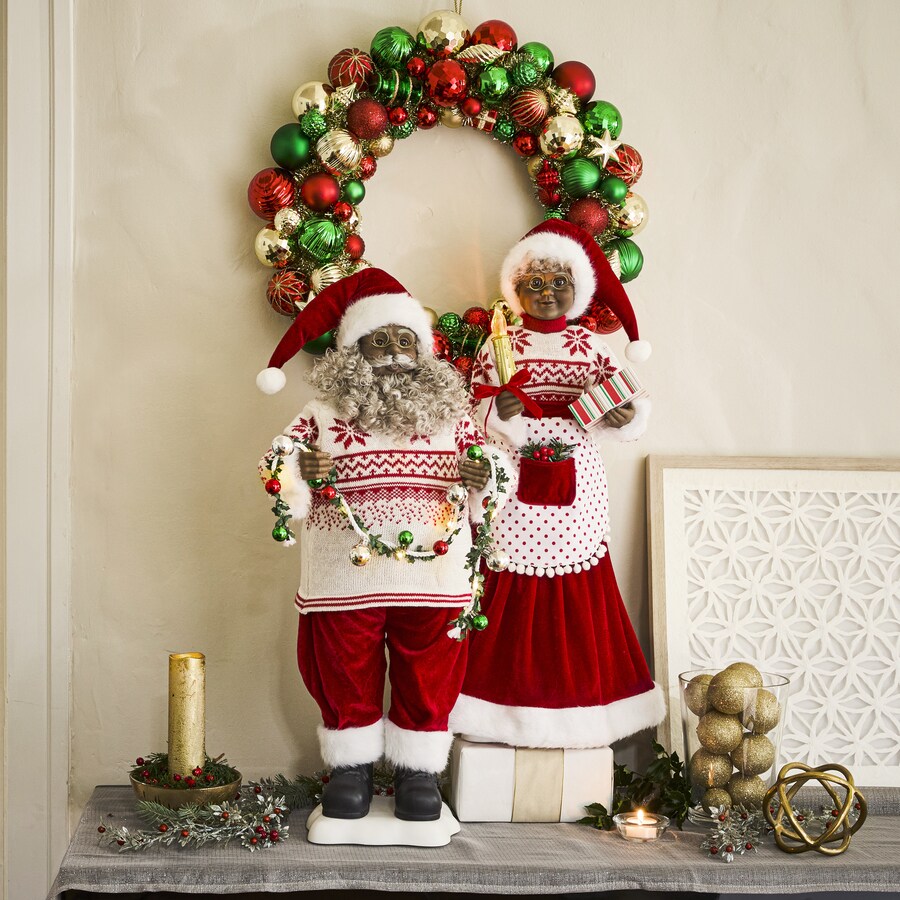 The Santa Stops Here Collection celebrates the nostalgia of the season and the man with the big red sleigh. Mr. and Mrs. Claus are styled with vintage outfits that compliment the shiny ornament wreath of green, gold, and red. Place these items in your favorite entertaining space to enhance the holiday spirit and to remind family and friends to be good for goodness sake.