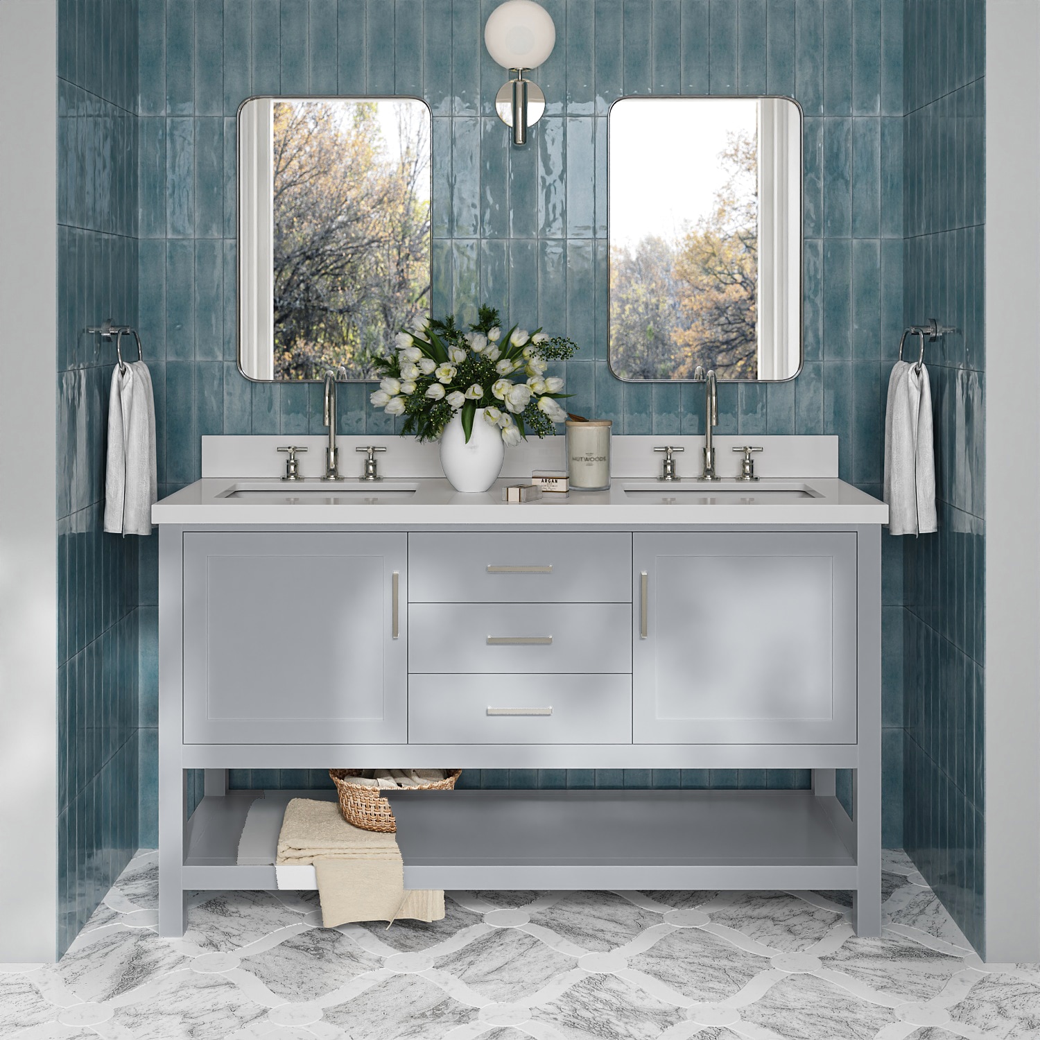 The ARIEL Bayhill Collection pairs classic farmhouse appeal with updated functionality, offering a cozy yet stylish option among bathroom vanities for today’s spaces. Handcrafted from high-quality solid wood and plywood, this 60 inch bathroom vanity features a pure white quartz countertop and matching backsplash. With ample bathroom countertop space and organized storage, this double sink vanity helps keep your bathroom functional and ready for daily use.