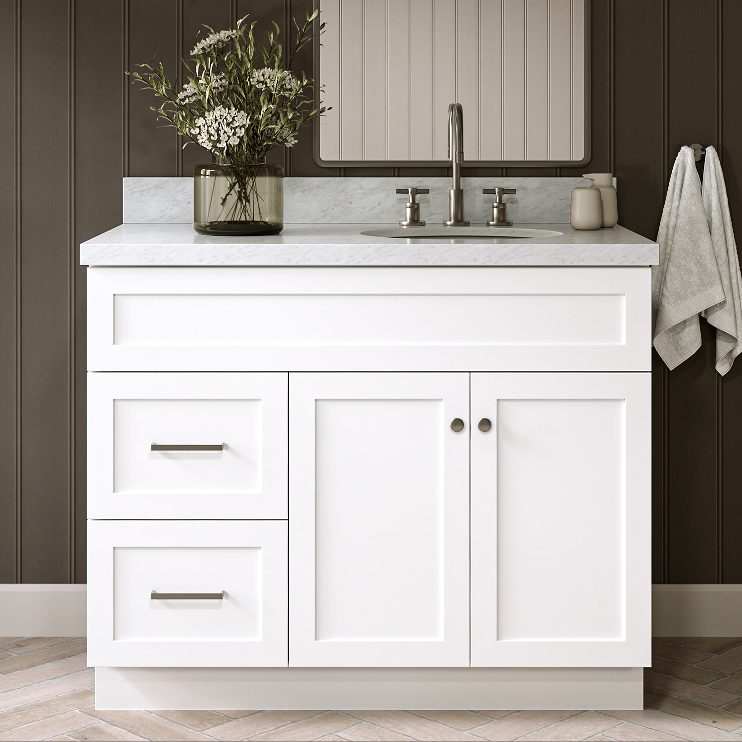 The ARIEL Hamlet Collection blends transitional design with everyday function, making it a reliable choice among bathroom vanities for today’s bathroom upgrades. Handcrafted from high-quality solid wood and plywood, this 42 inch bathroom vanity includes a carrara white marble countertop and matching backsplash. With ample bathroom countertop space and organized storage, this single sink vanity helps keep your bathroom functional and ready for daily use.