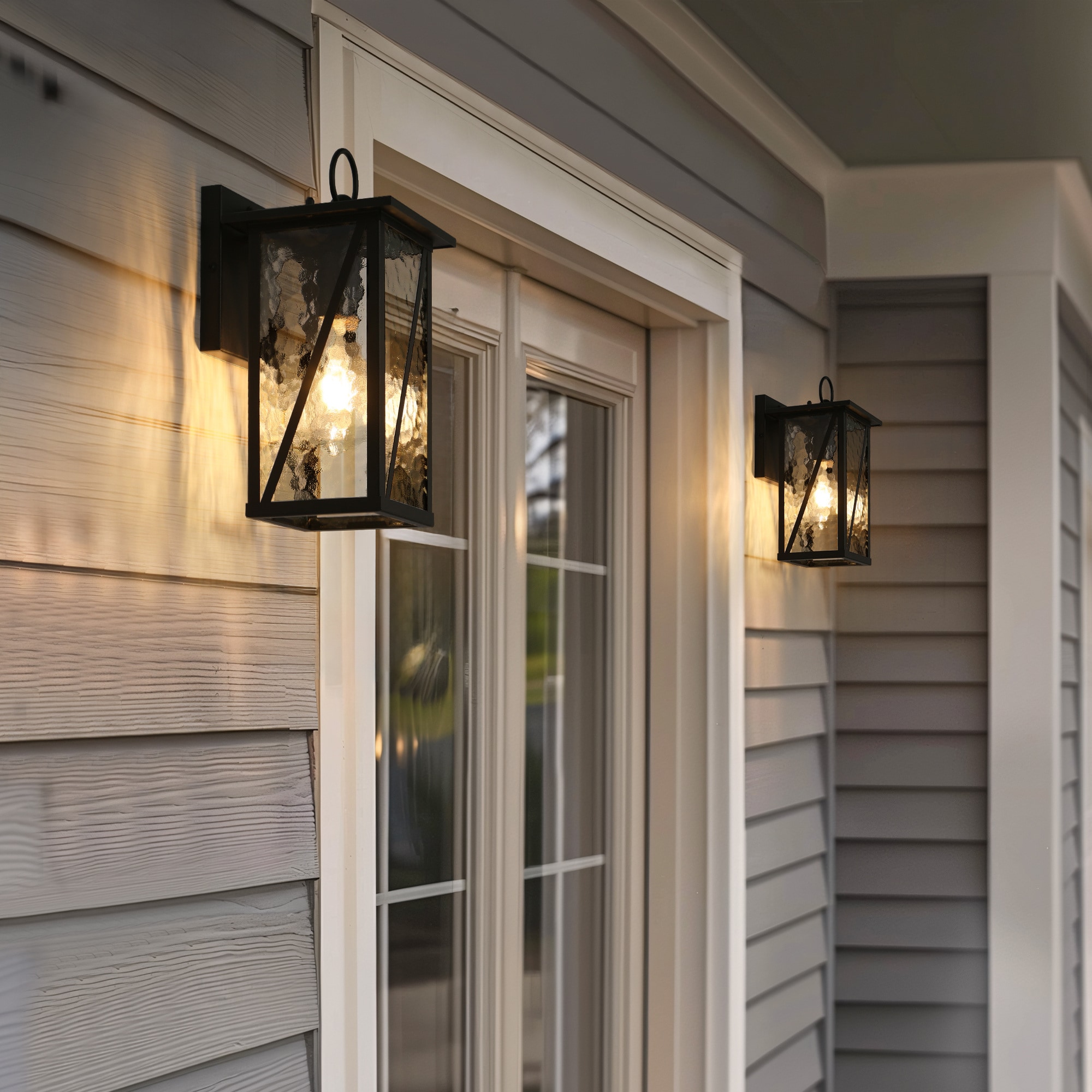 This black outdoor wall lantern sconce is perfect for enhancing your outdoor space with style and functionality. This modern/contemporary style fixture features a rectangular silhouette with a sleek, matte black finish. The clear water glass shade allows for maximum light flow and a classic, clean look. Superior waterproof sturdy aluminum construction with water glass shade enables this outdoor wall light ideal for all kinds of damp environments. No fear of rainy days. It would be ideal to be mounted at the front porch, patios, pergolas, outdoor kitchens or BBQ areas, poolside areas, garage walls, and building entrances.