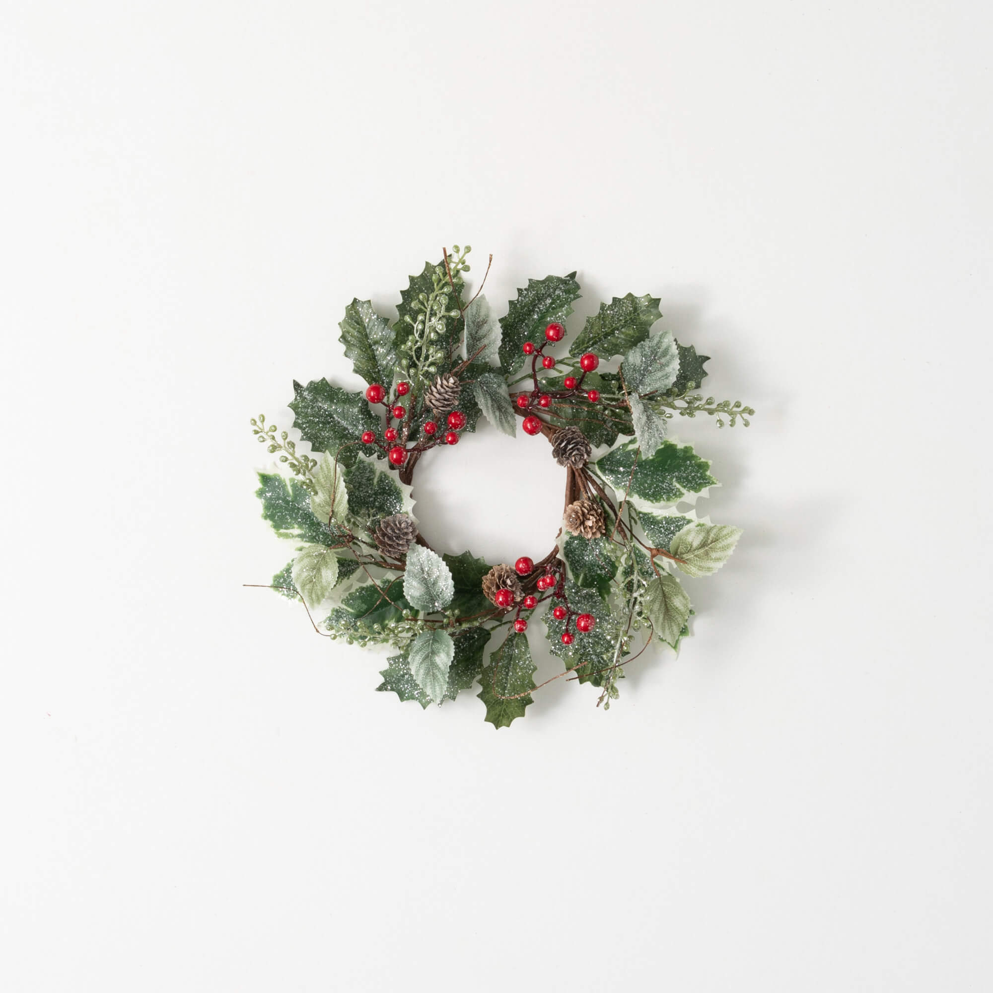 Enhance the glow of your holiday candles with our exquisite 13"H Frosted Holly Mini Wreath Christmas Candle Ring, designed to add a touch of elegance and charm to any candle display.