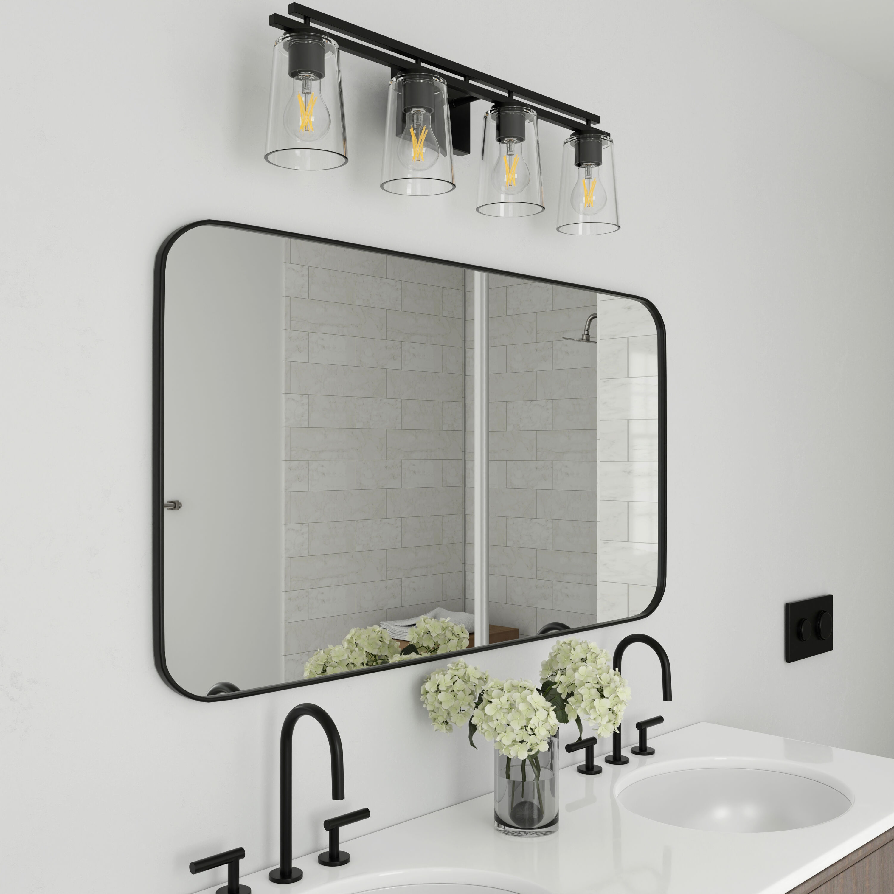 - This vanity from the Houlton collection features a refined and updated design with an elagent black finish and clear glass shades