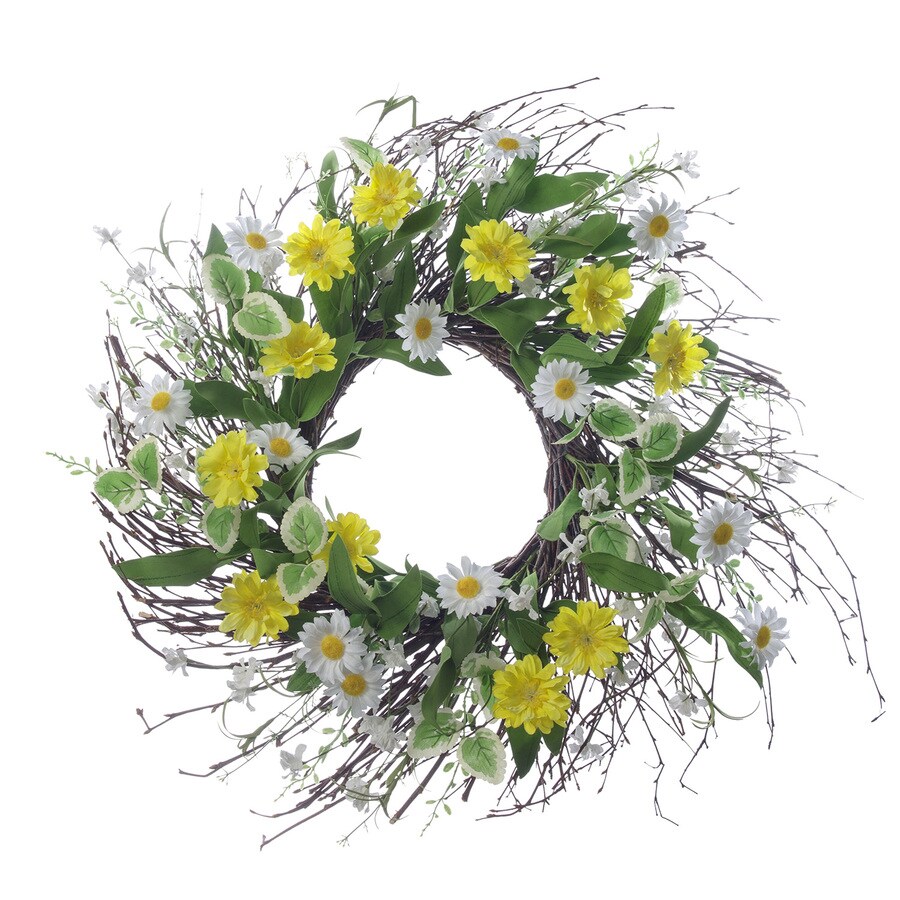 This beautifully bright Daisy mix wreath layered upon a twig base provides all the beauty of a live plant without the maintenance