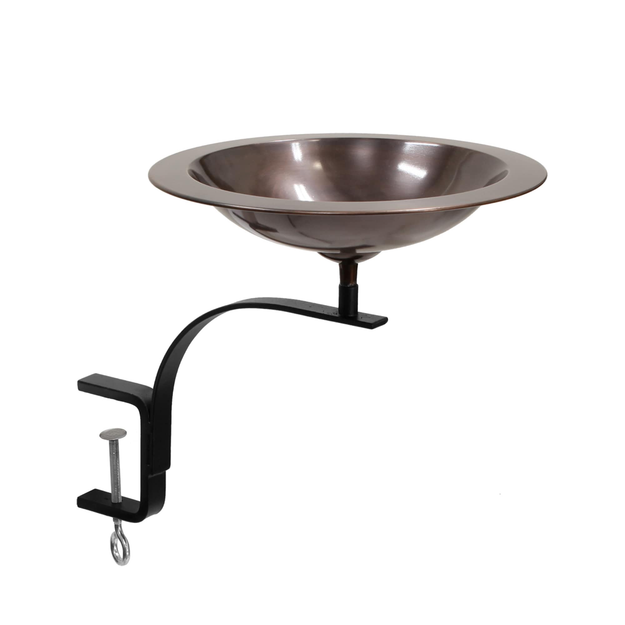 This Rail-Mounted version of our Classic Birdbath has a simple copper bowl with a wide rim for birds to perch while drinking and bathing. The threaded base on the underside of the bowl attaches to a Railing Bracket. Ideal for porches, balconies or deck rails, the wrought iron bracket has C-type clamp that holds the bracket to a deck or handrail without need for drilling or permanent mounting.