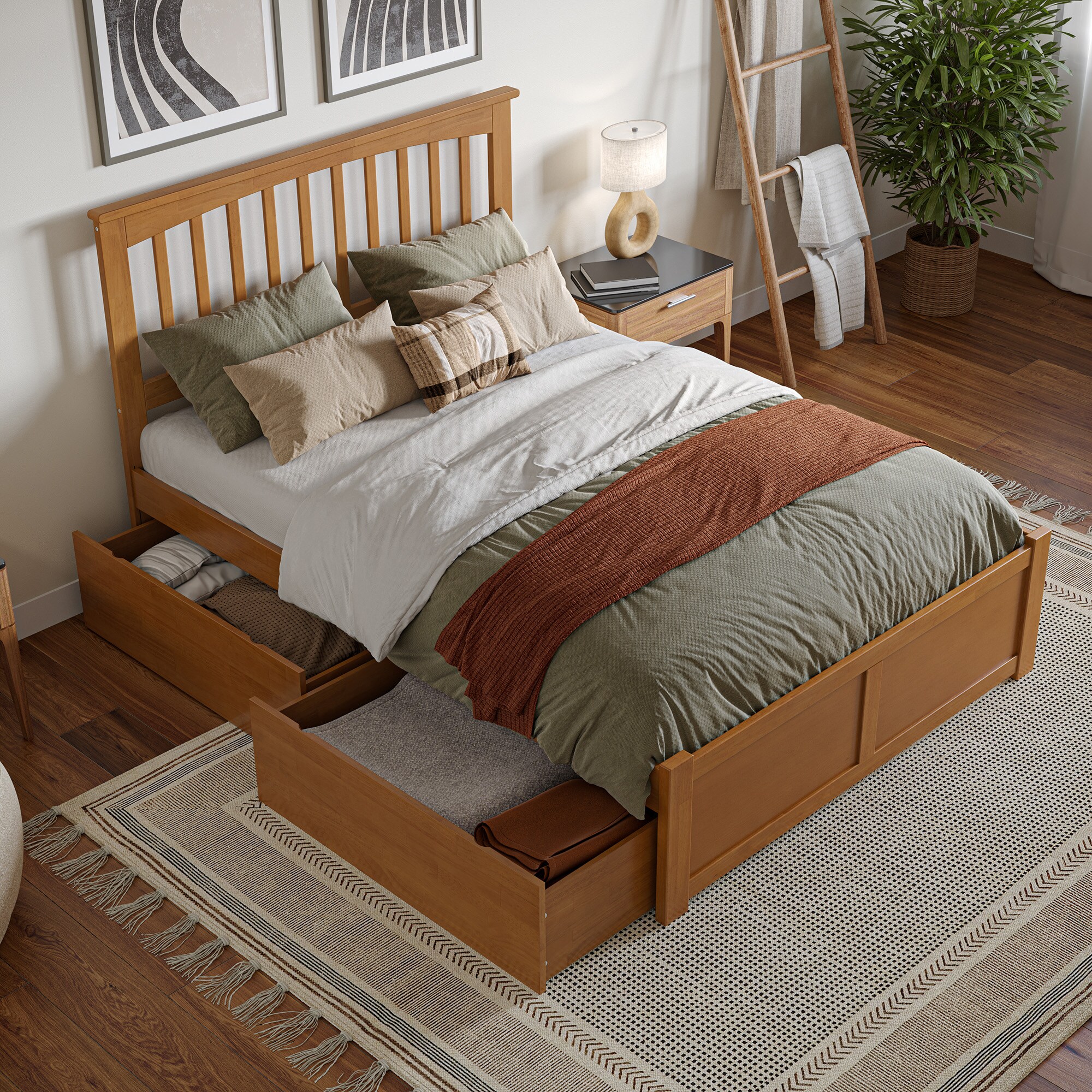 Introducing The Mission Solid Wood Platform Bed with Footboard and Set of 2 Underbed Storage Drawers – a timeless blend of classic craftsmanship and modern convenience. Crafted with precision, this stunning bedframe exudes true Mission style, offering an elegant addition to your bedroom. Crafted from high-quality solid wood, The Mission is built for durability and longevity. Available in Twin XL, Twin, Full, Queen, or King sizes, and a range of beautiful colors, including Espresso, White, Walnut, Grey, and Light Toffee, you can easily find the perfect fit for your style and decor. Say goodbye to cumbersome foundations and box springs – this bed arrives with a strong slat kit for hassle-free assembly. The framed slatted headboard adds a touch of sophistication to your bedroom, making it a focal point that enhances the overall aesthetic. Inspired by classic Mission-style design principles, this bedframe pays homage to traditional craftsmanship while incorporating modern functionality. Plus, it comes with a set of 2 underbed storage drawers allowing you to declutter your space and keep essentials close at hand. Elevate your sleep experience with The Mission Solid Wood Platform Bed with Footboard and Set of 2 Underbed Storage Drawers, where style meets substance – a true mission accomplished for your bedroom upgrade!