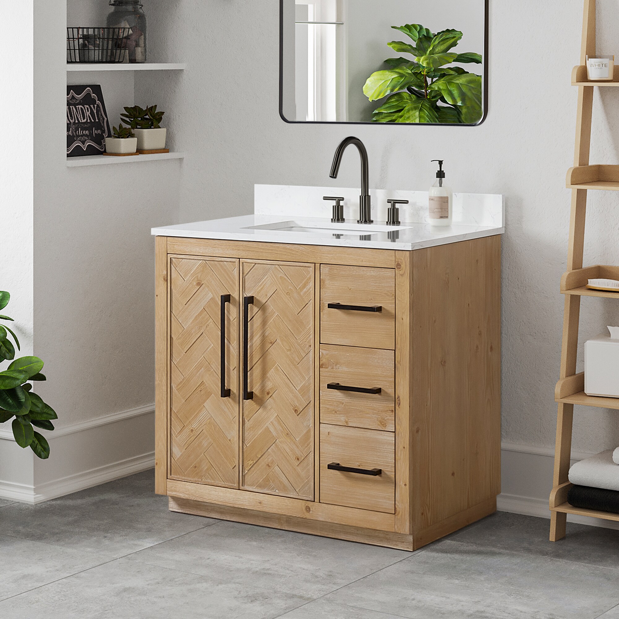 Looking for a light, bright, and natural sense of your bathroom? Our Bellavia vanity features with weathered fir that showcases a unique and rustic charm. Finely handcrafted jointing door front with a chic chevron pattern creates a modern and sophisticated aesthetic. By creating a recessed plinth base at the bottom, enhance the visual appeal and sophistication of space. With a beautifully marbled engineered stone countertop, our vanity adds class, distinction, and functionality to any guest or master bath in your home.