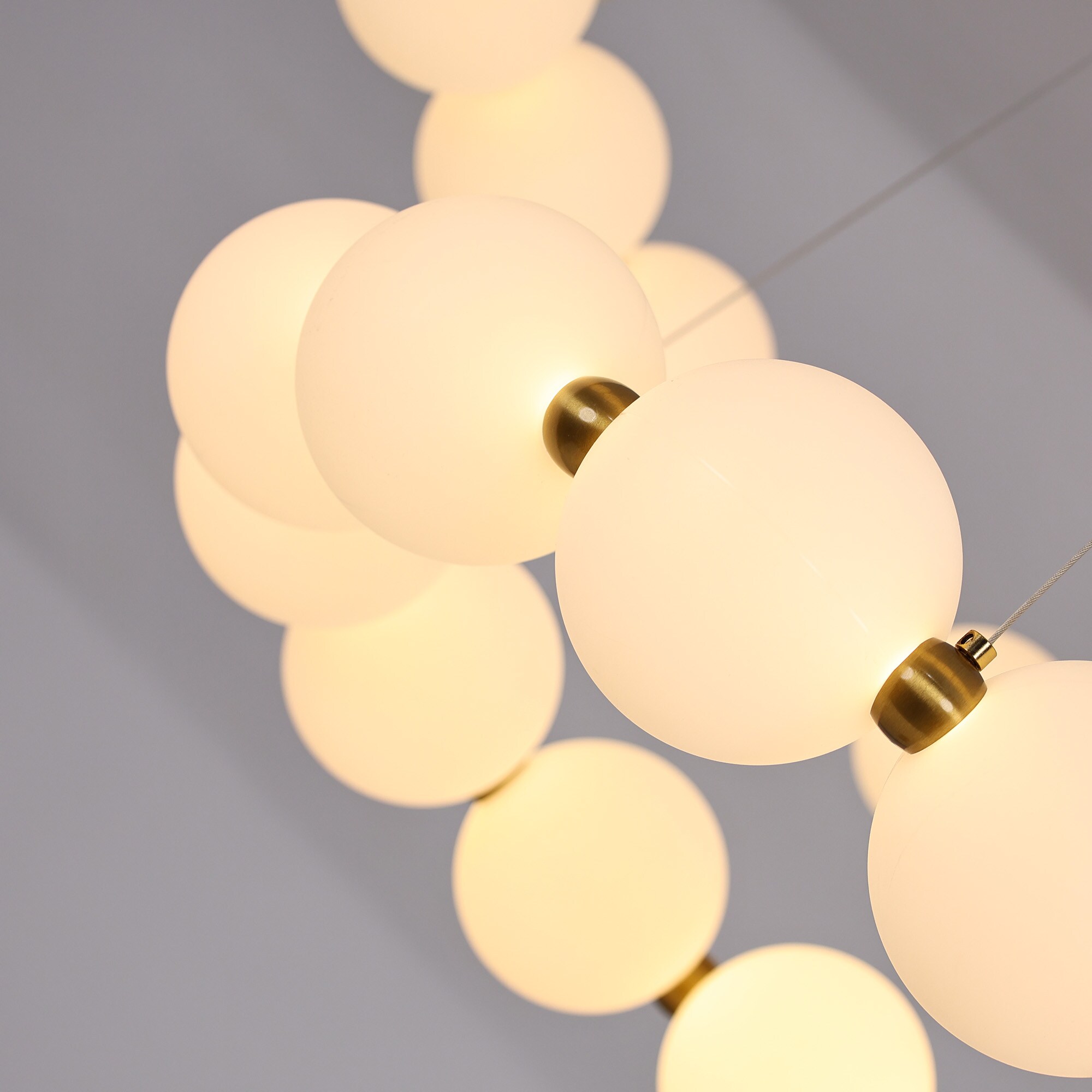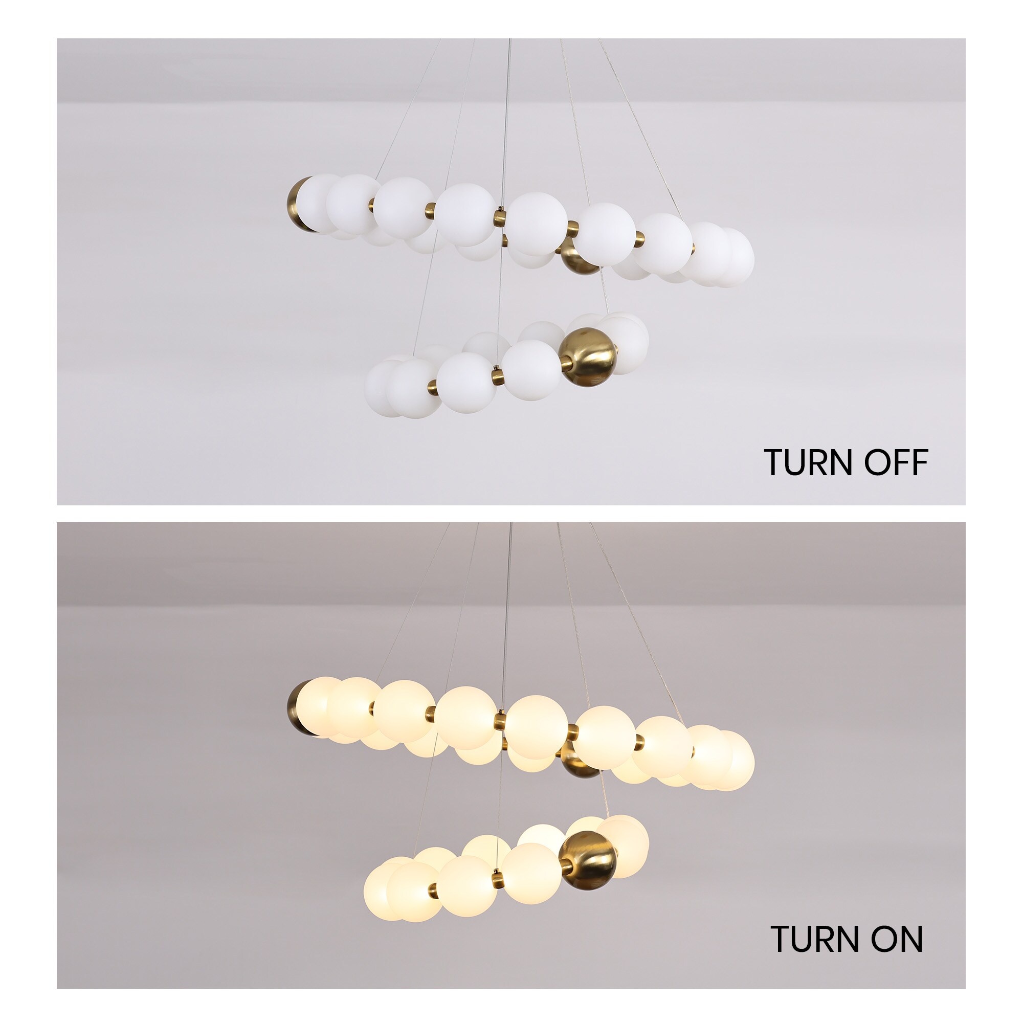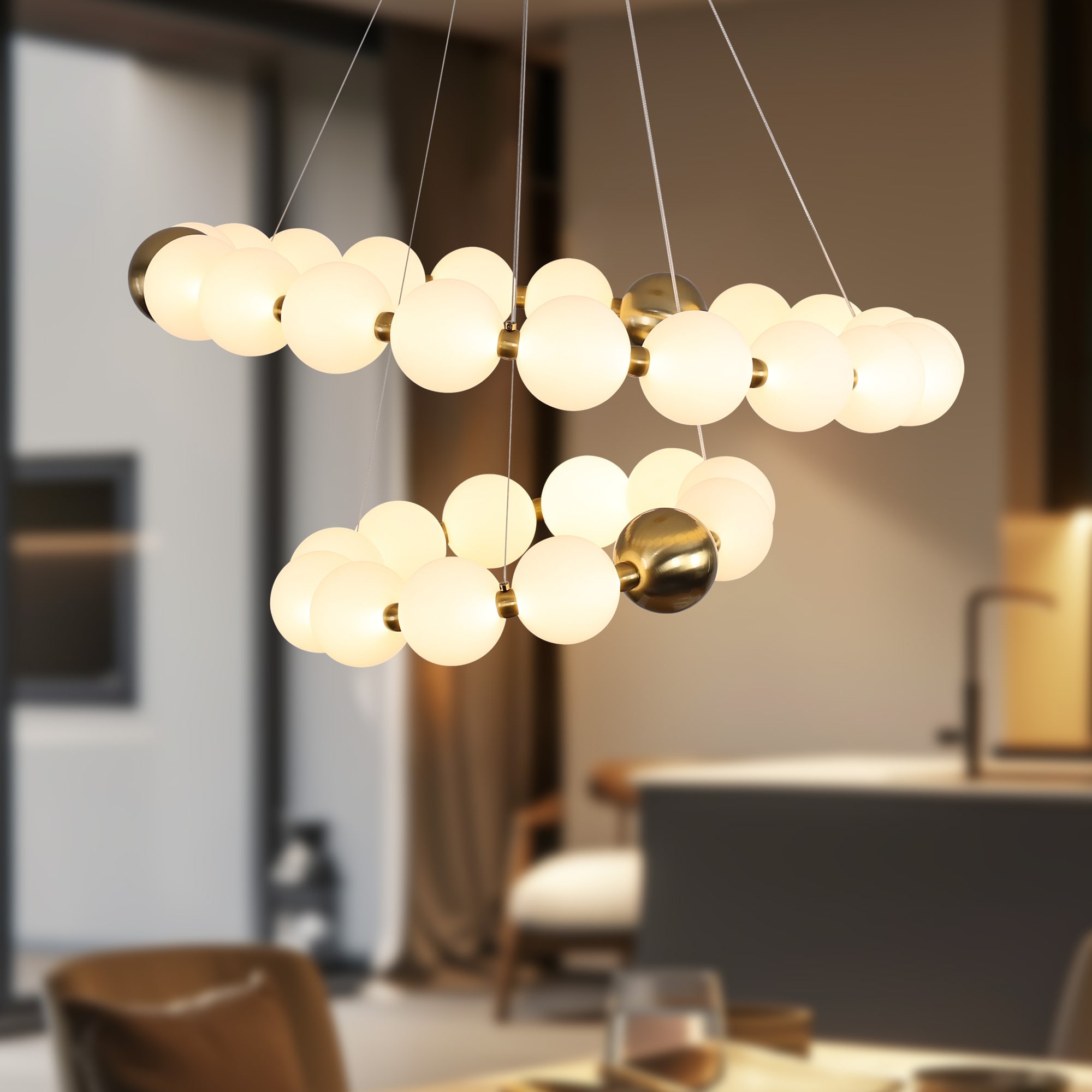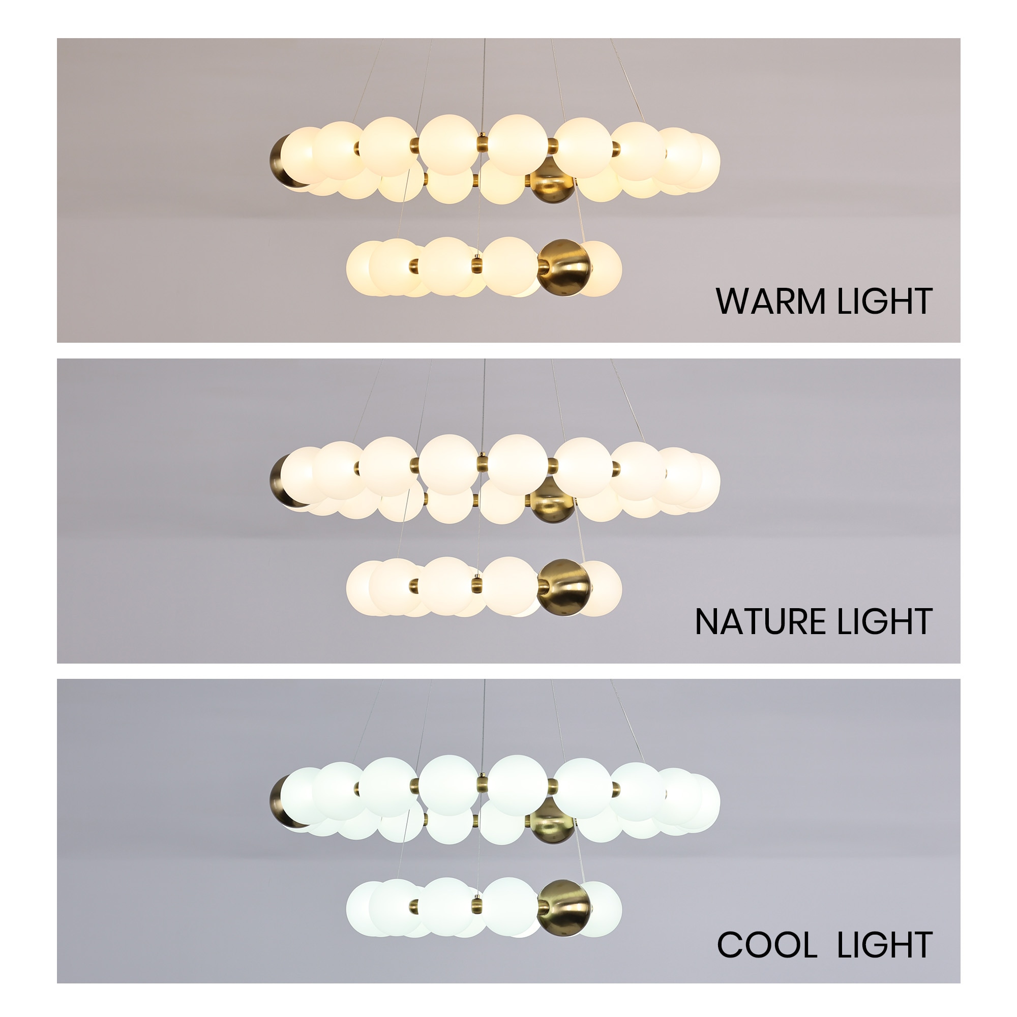 This modern brass globe chandelier elevates living rooms, dining areas, and stairwells with its sculptural design and warm ambiance. Featuring three adjustable color temperatures, it easily adapts to different moods and settings throughout the day. The adjustable hanging height up to 78.7" allows for versatile installation on flat or sloped ceilings. Two integrated 37W LED light sources offer bright, energy-efficient lighting, while the frosted glass globes and brushed brass finish add elegance and softness. Ideal for medium to large spaces, this chandelier merges modern artistry with everyday functionality for a truly distinctive centerpiece.
