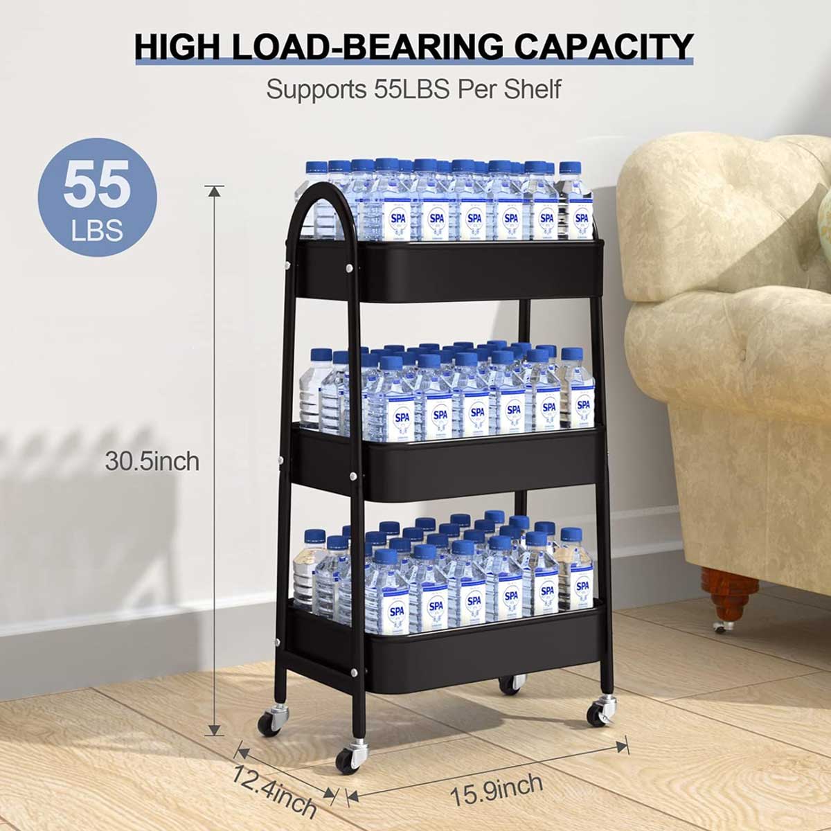 Aoibox 3 Tier Utility Rolling Cart Metal Storage Organizer with Handle and Lockable Wheels Multifunctional Trolley for Kitchen Living Room Office Garage Black