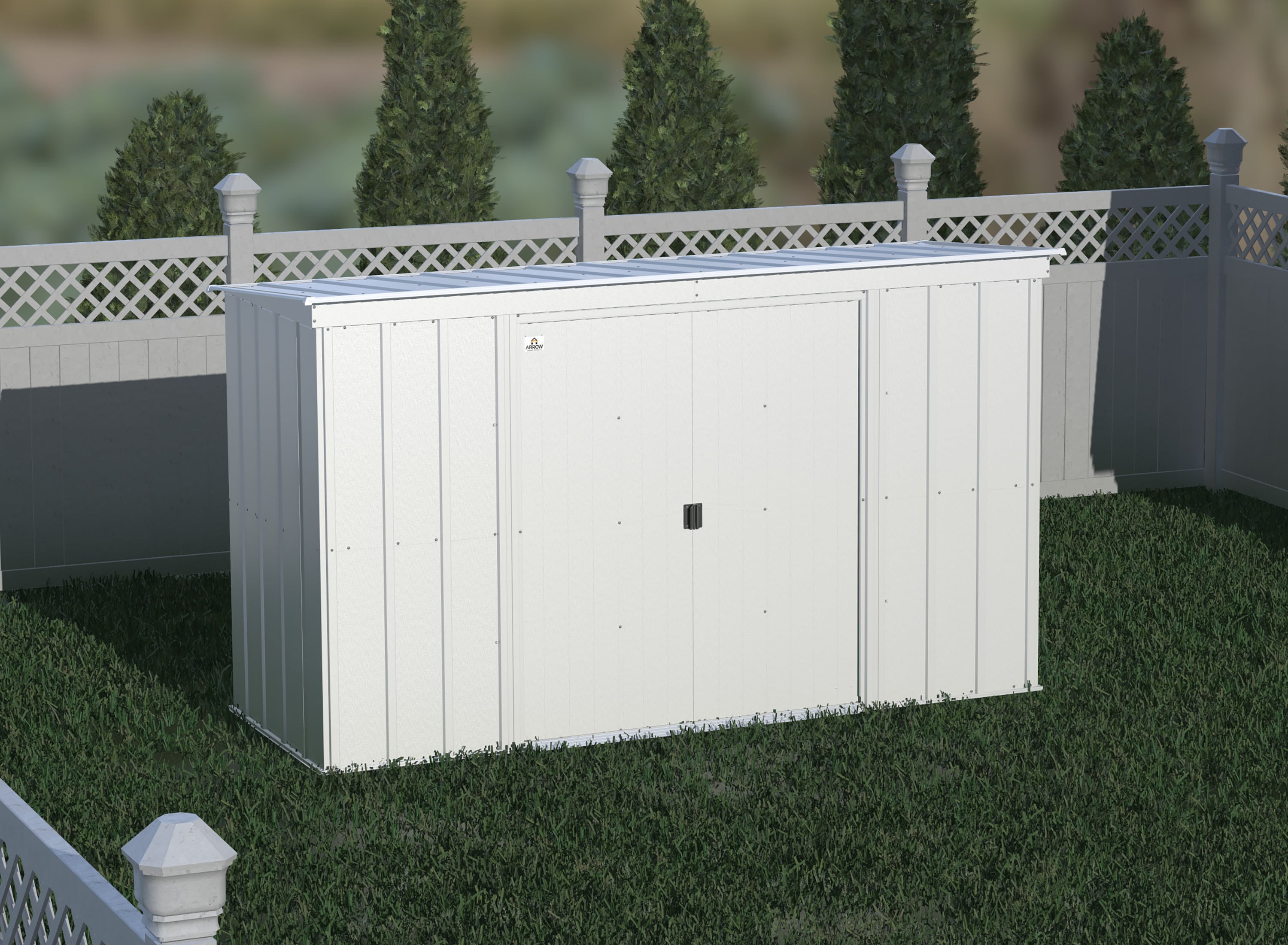 Are you looking for a practical, sturdy storage unit for your backyard? The Arrow Classic series metal storage shed is engineered to protect your landscaping equipment, tools, and gardening supplies from the elements. The shed is made of galvanized steel that’s treated to prevent rust and corrosion. It has a low gable roof that’s designed to prevent water from pooling. It has sliding doors that can be secured with a padlock. The Arrow Classic is a good-looking unit, too. The shed’s timeless vertical wall panels are finished with smooth, hard-wearing Sherwin Williams polyester paint finish, which protects it against the elements and seals the steel against rust and corrosion.