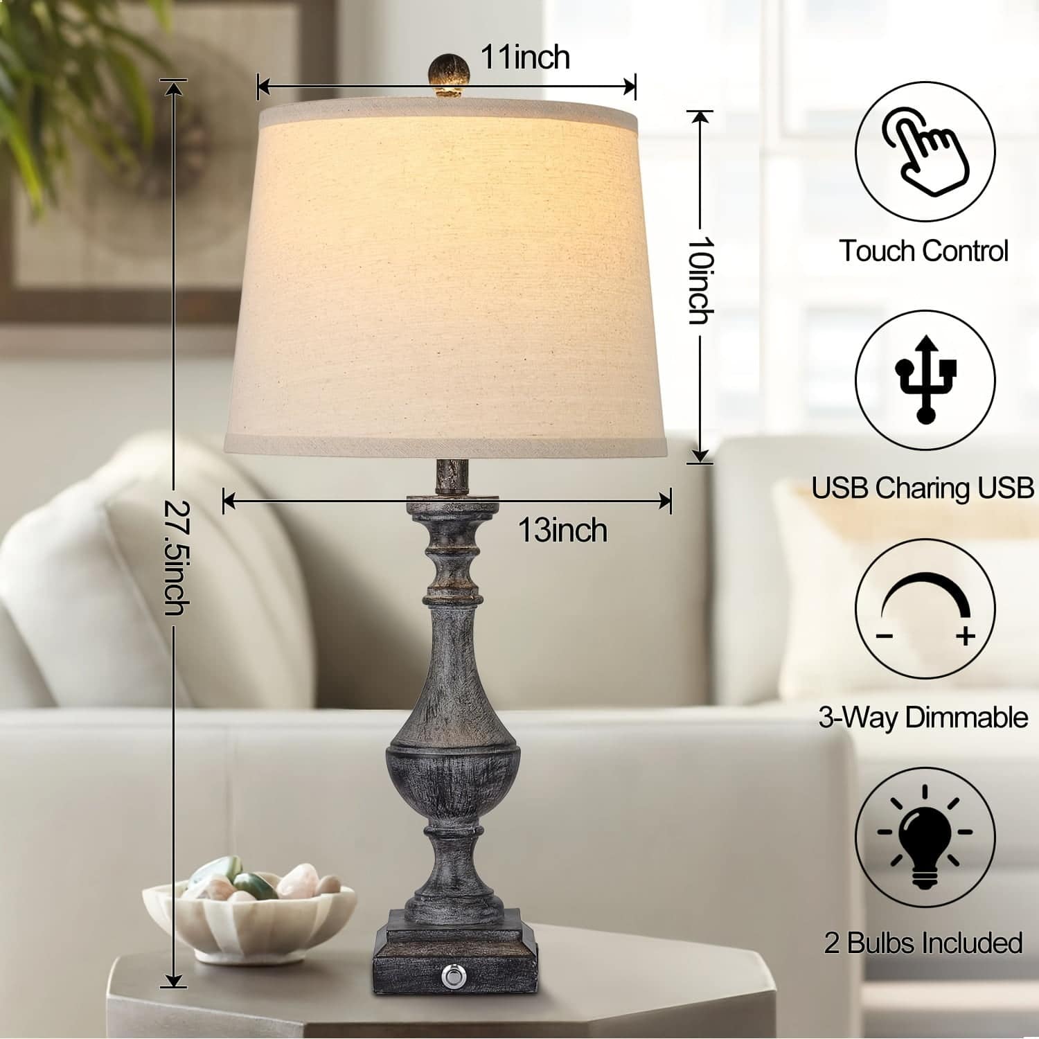 BIGHOUSE 2 Set 27.5 Inch Tall Coastal Table Lamps Set For Living Room With 2 Dimmable LED Bulbs Touch Control 3 Way Dimmable Bedside Lamp 9W Bright USB + Type C Charging Ports Natural Linen Shade Gifts For Birthday House Warming Wedding Grey White