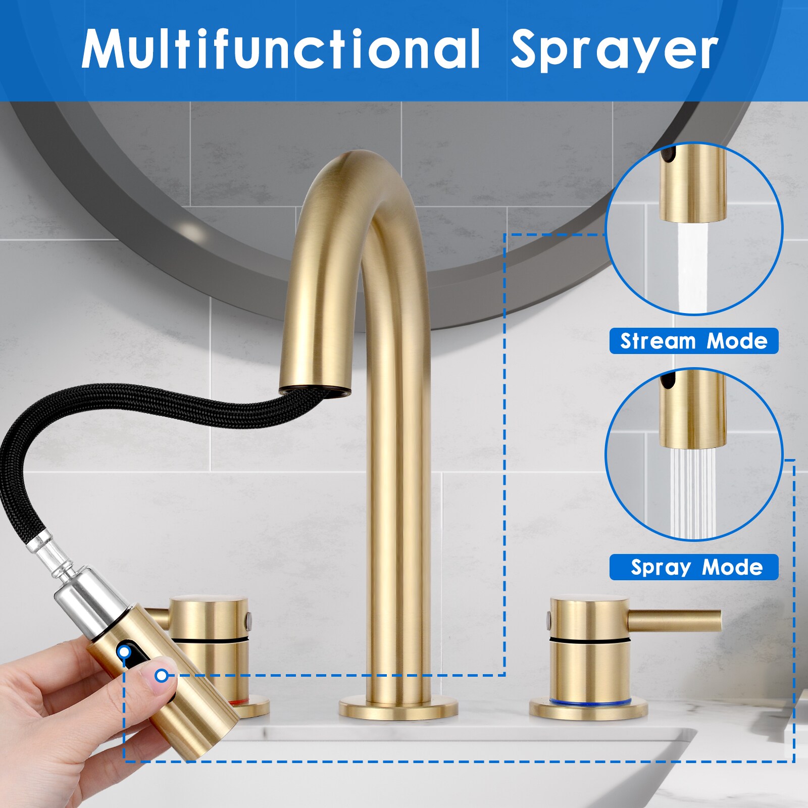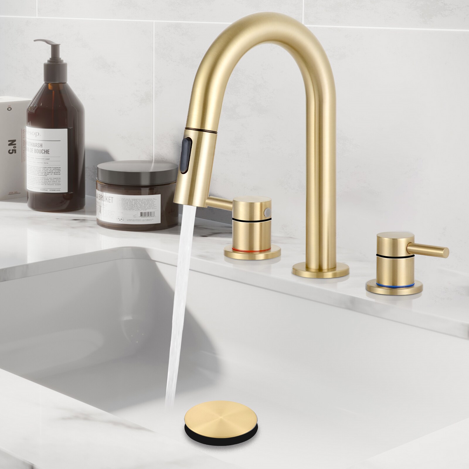 BOKETTO TPLT-012 Brushed Gold Widespread 2-handle Low-arc Commercial/Residential Handle Pull-down Bathroom Sink Faucet with Drain
