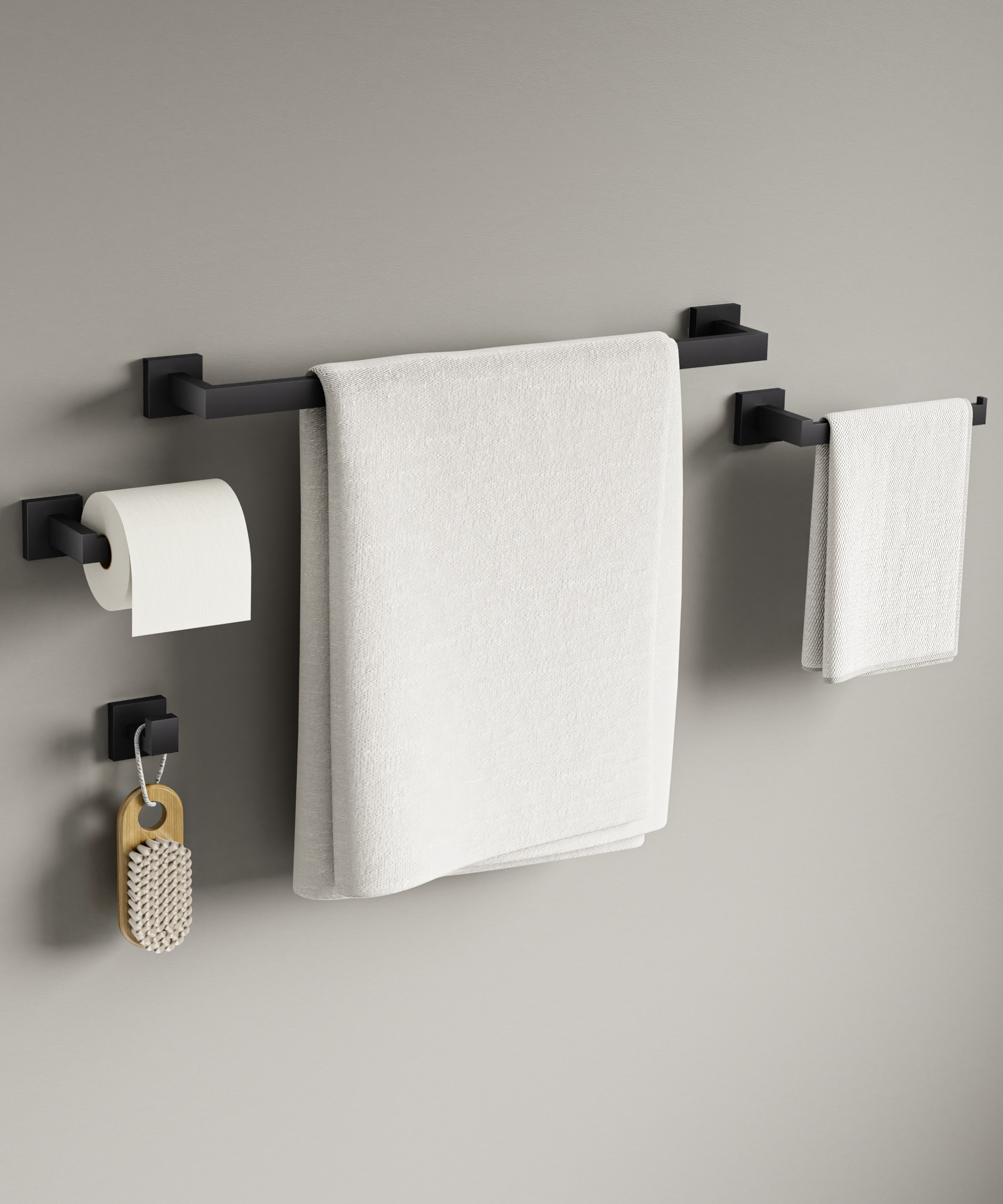 21.9" towel bar x1, toilet paper holder x1, square closed towel ring x1, robe hook x2