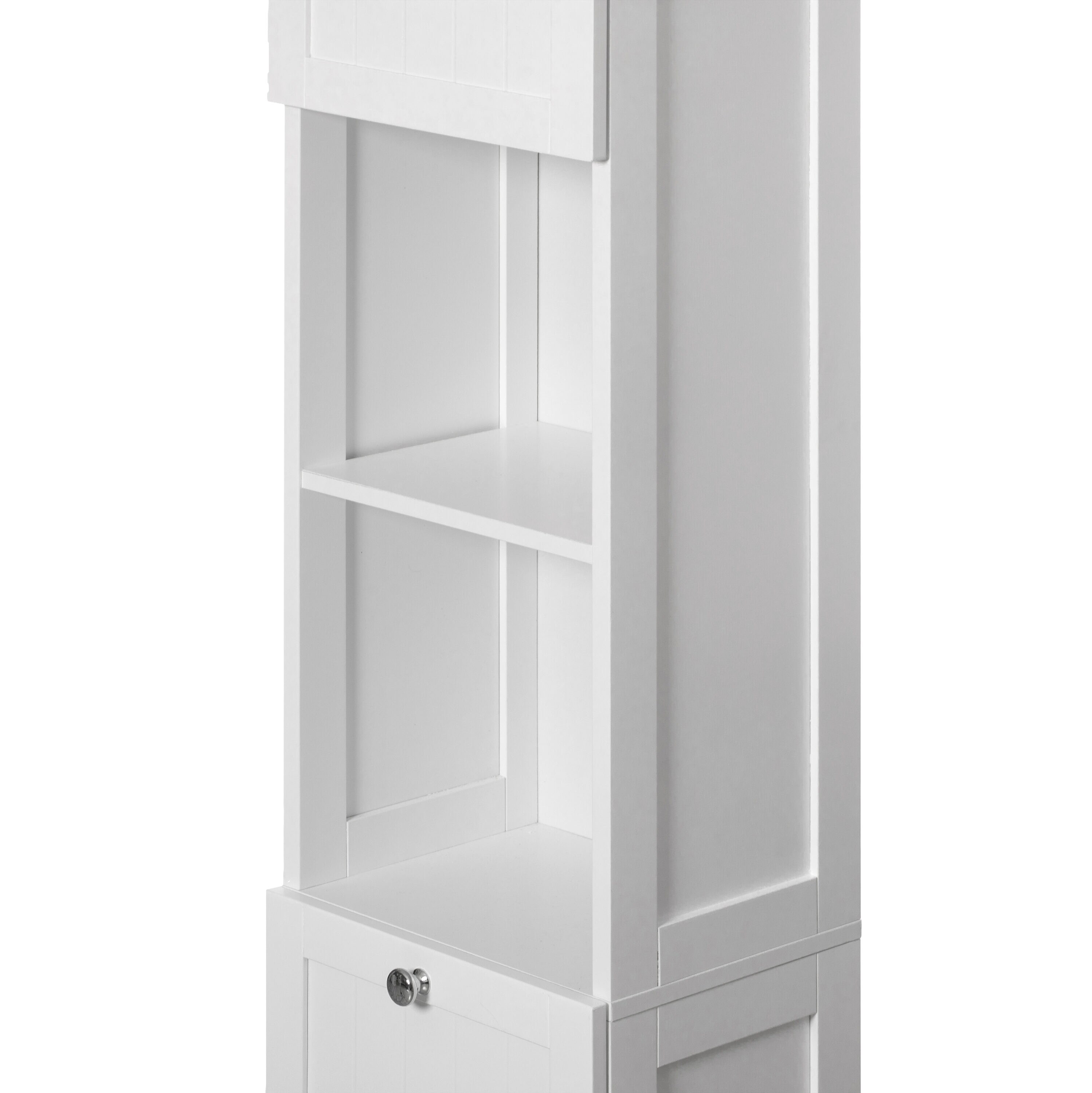 Keep bathroom essentials organized at hands reach when stored in this tall modern bathroom cabinet, The interior offers 2 closed storage section with 2 open shelves for different preferred levels, one drawer and open area to store and display, This cabinet holds bathroom essentials accessible inside and a clean contemporary exterior for bathroom decoration, Your bathroom's organization starts with this bathroom cabinet