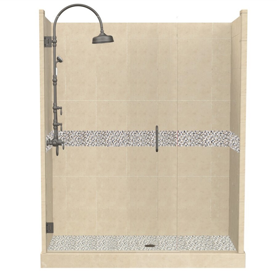 5/8" x 5/8" Java glass/stone mosaic accents on floor and 6" liner, Sistine Stone 12" x 12" medium wall and threshold tiles