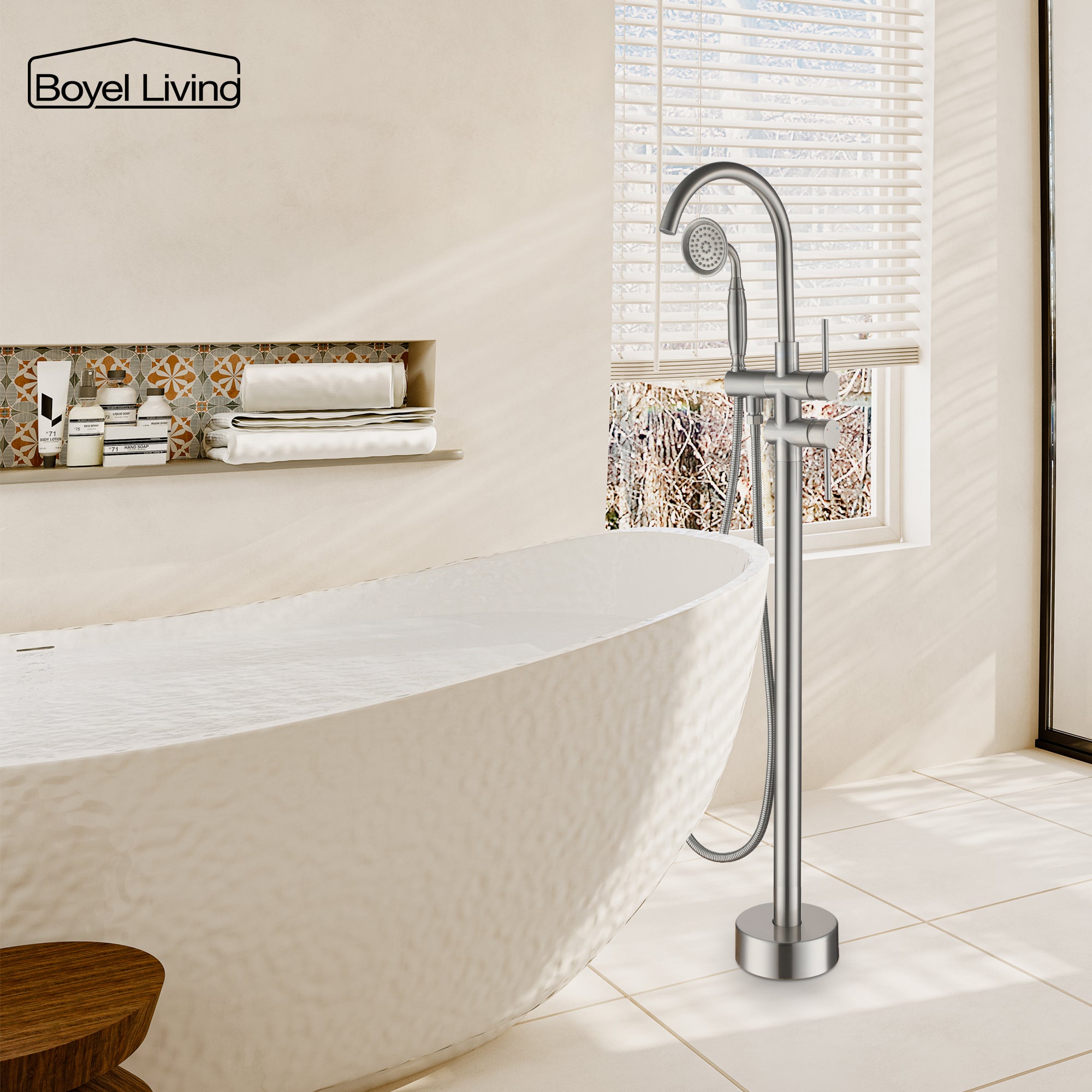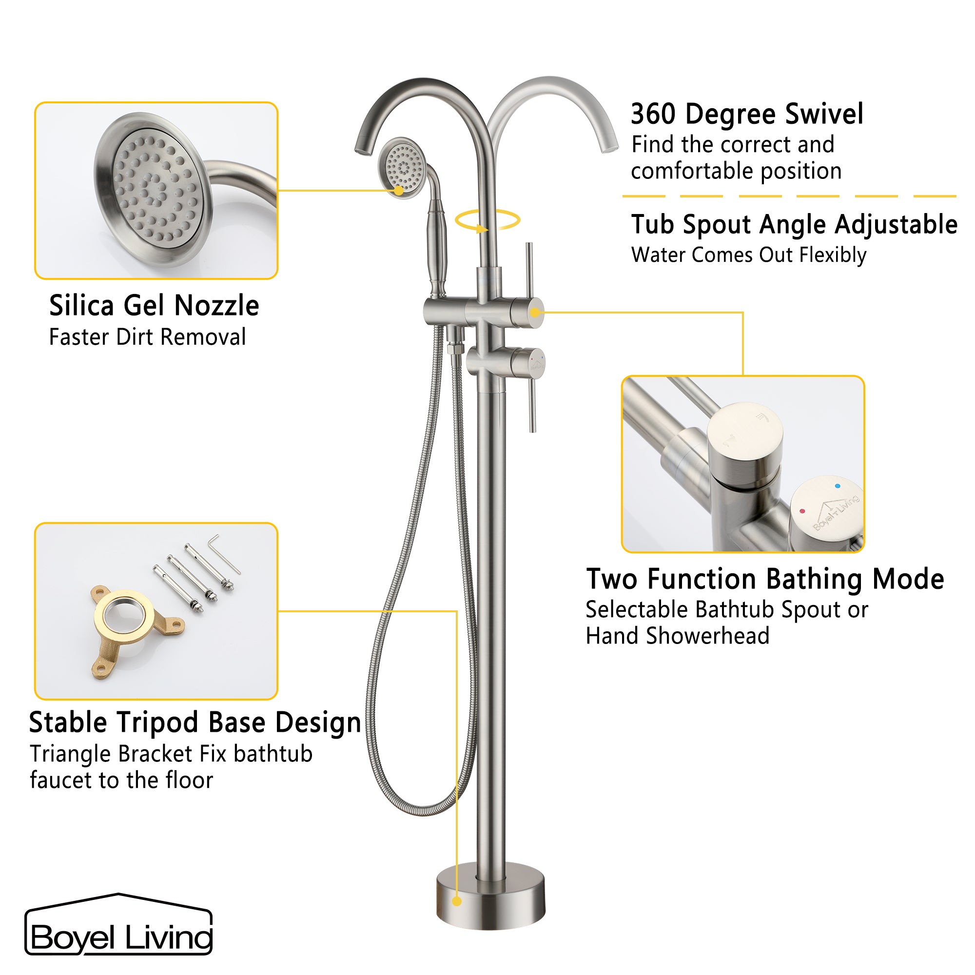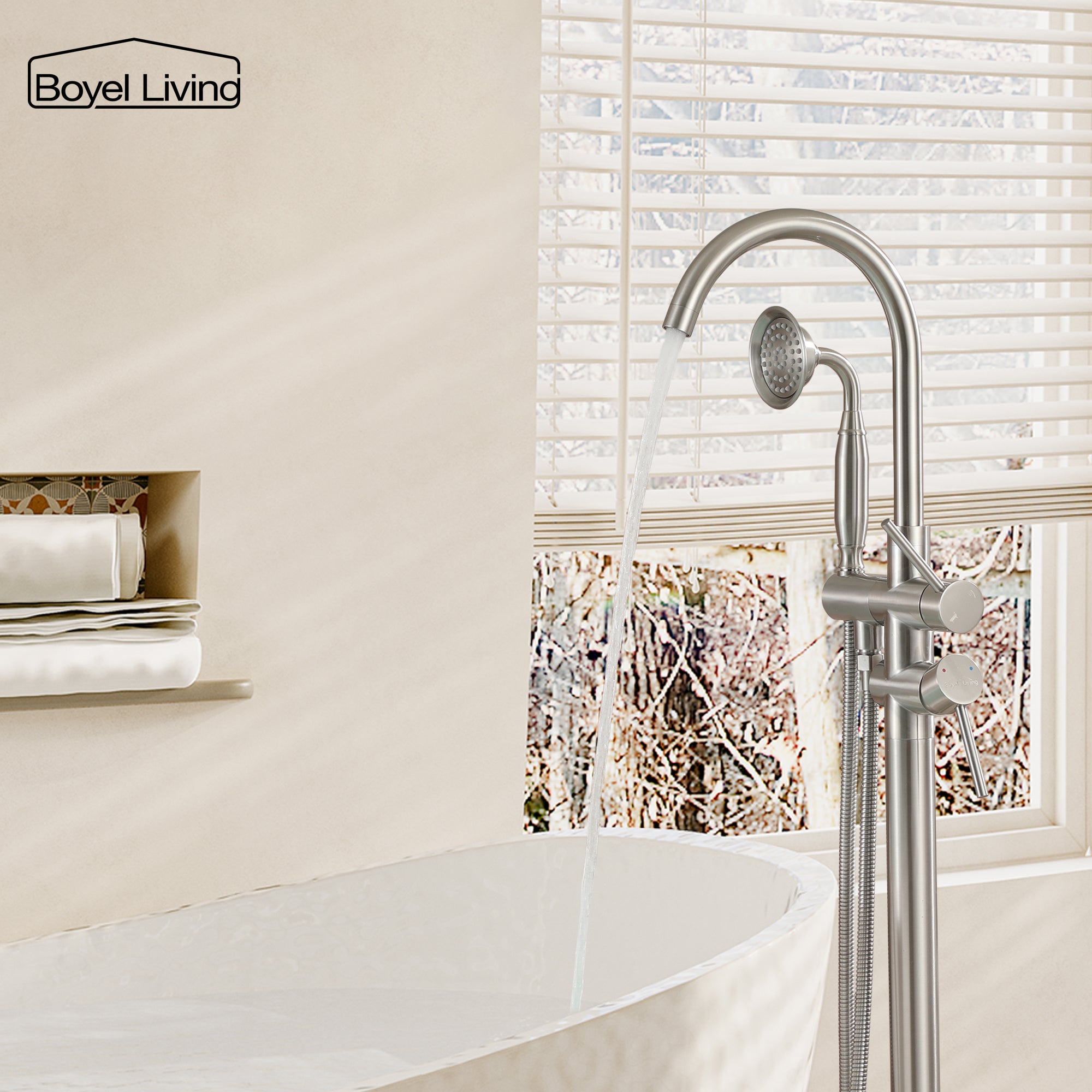 Boyel Living 6 GPM 2-Handle Floor Mount Freestanding Tub Faucet with Hand Shower and Built-in Valve in Brushed Nickel