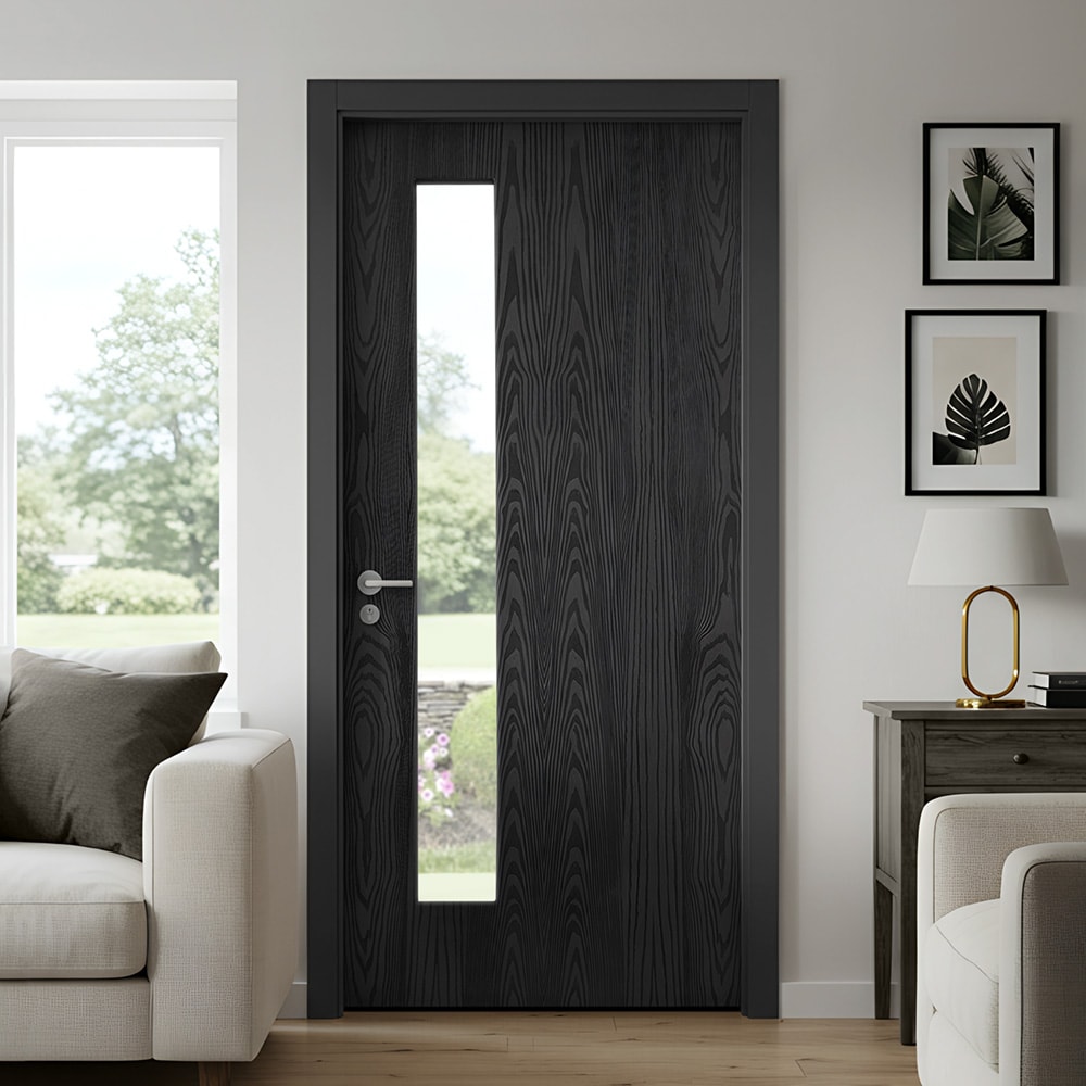 CALHOME Modern Exterior Fiberglass Front Entry Door with Clear Glass offer a remarkable fusion of artistic design and robust performance. Crafted with meticulous attention to detail, these doors redefine the entryway of any modern home. With its black finish and clear glass, this door is built to impress and endure.