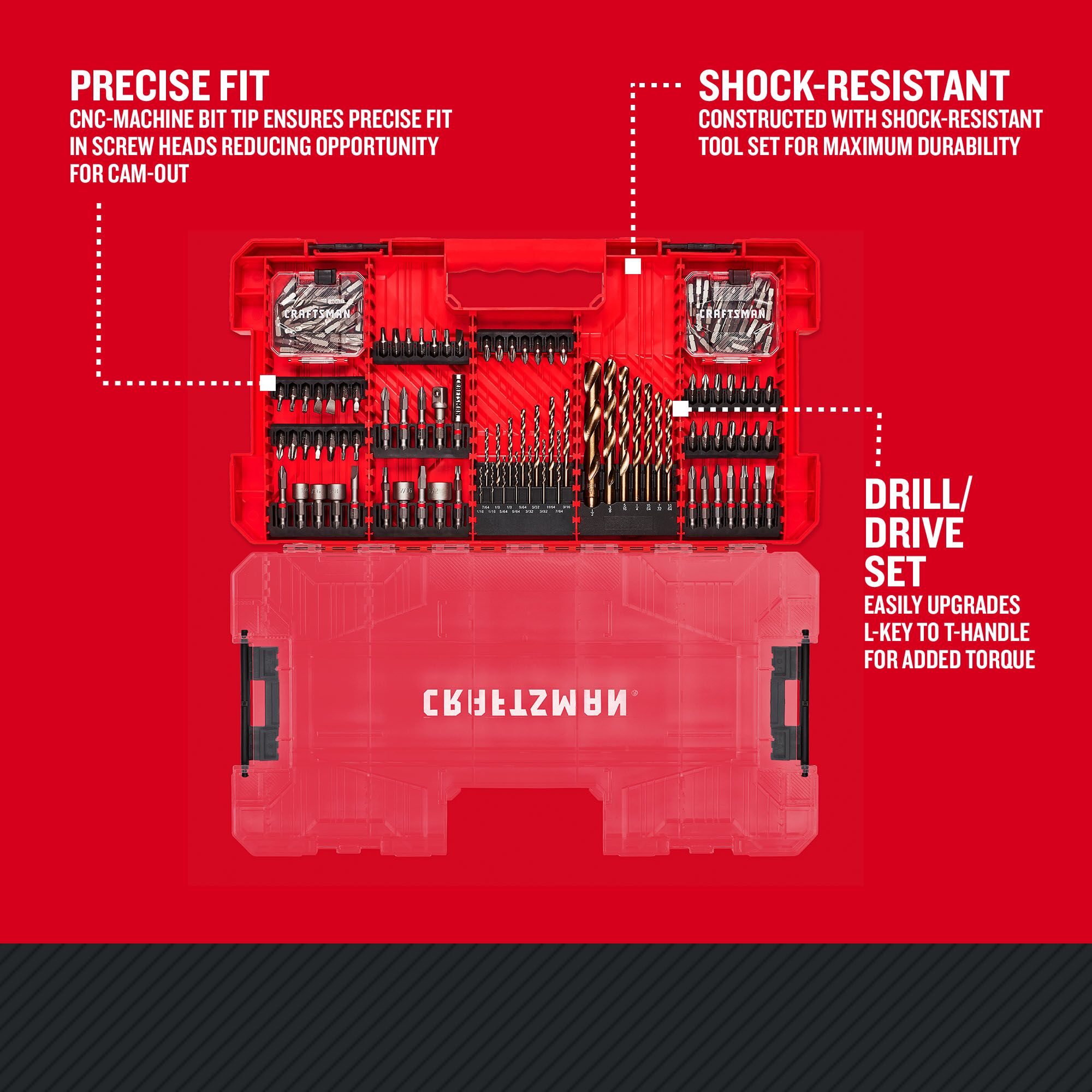 The CRAFTSMAN® 140-piece impact drill/driver bit set will extend your handyman capabilities tenfold. It contains four ranges of drill bits for a variety of applications. You’ll finish construction and home improvement work, like installing fixtures around your house, upgrading furniture and cabinets, fixing damages in the interior rooms, refurbishing your garage and outdoor space, and more. The bits are made of shock-resistant tool steel to resist a high level of impact and torque during tough applications. The bit tips are all CNC-machined to ensure a snug fit and reduce cam-out. Everything comes in a hard-type case for easy storage. Shop this set at Lowes.com today.