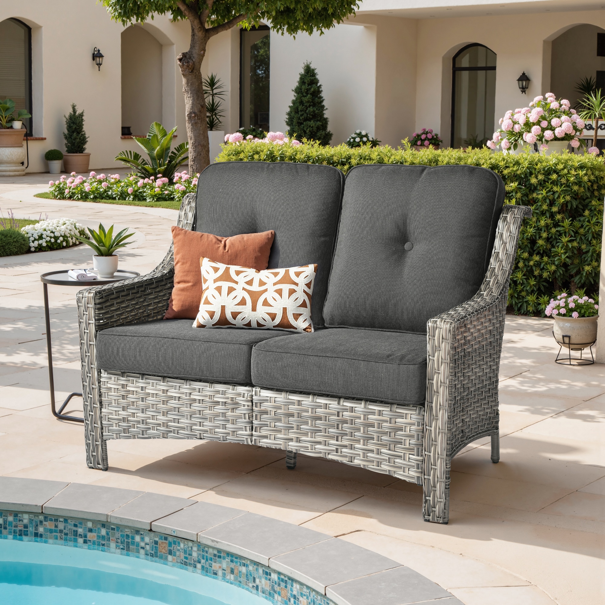 Caodoc Linear Rattan Outdoor Sofa with Black Cushions and Rattan Frame