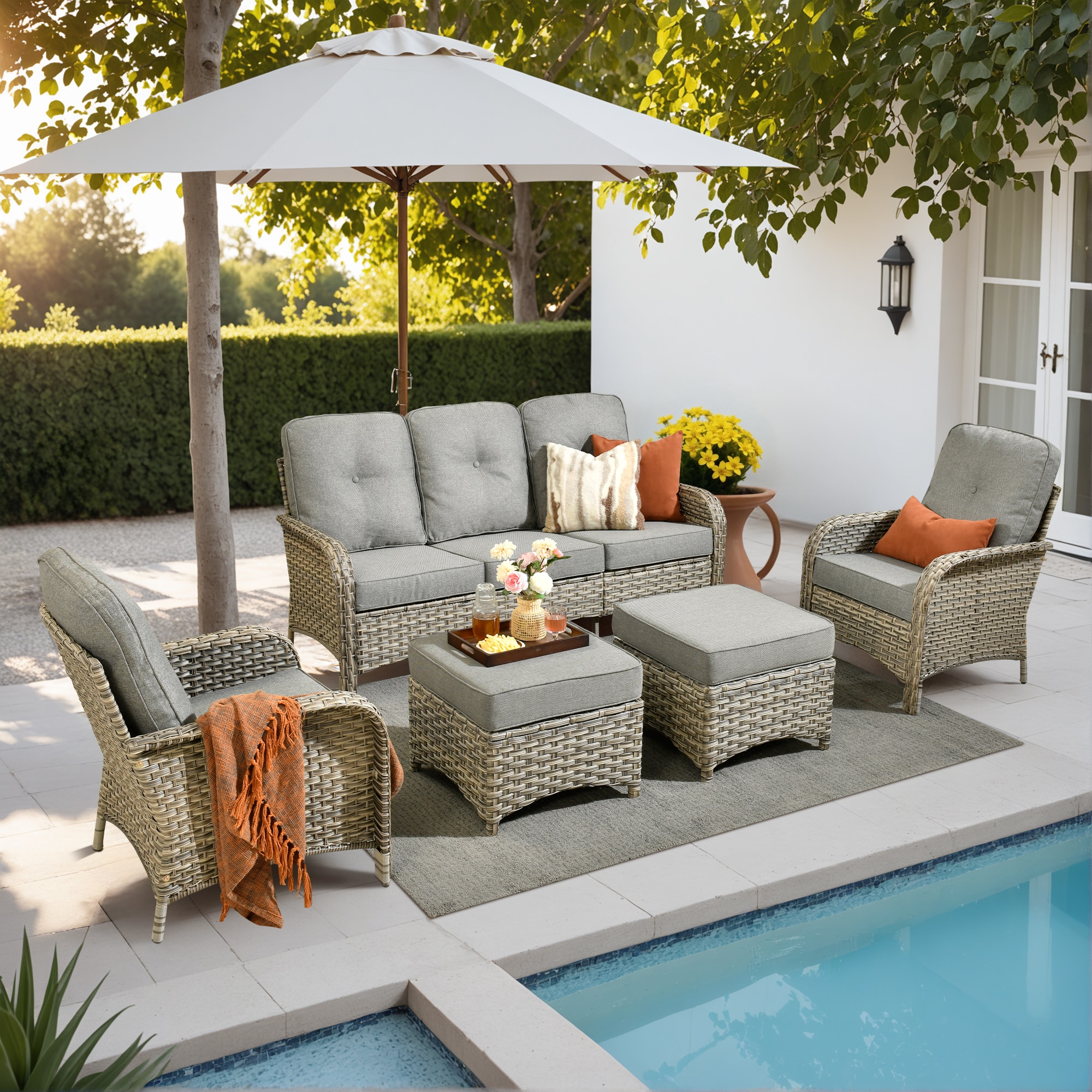Caodoc aims to create a green,comfortable and stylish outdoor life for you,the patio set can comfortably seat 5 people,the design of this furniture combination is fashionable and atmospheric,and the tone impact is strong,the commercial use of the standard seat of the chair guarantees you the ultimate comfort, the product is practical and stable,the material is environmentally friendly and green, and the use is assured, for your more comfortable leisure time,our sofa set is really your choice.