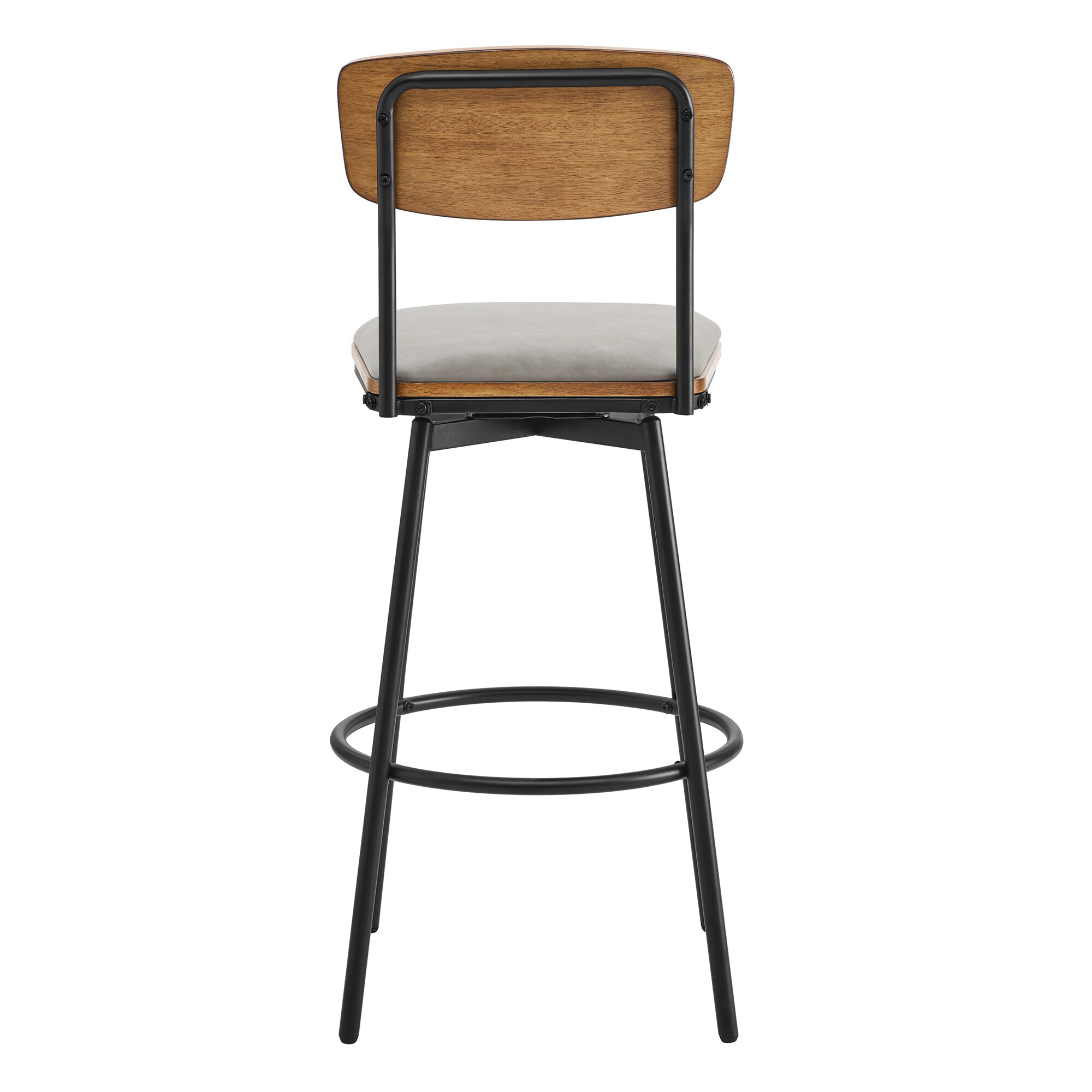 An ideal blend of style and function, this Wynne Wood and Metal Stool brings extra seating and modern style to any kitchen island, pub table, or home bar. The stunning mixed-material look adds contrast and visual interest to your aesthetic. 360-degree swivel maximizes comfort and convenience. With a simple spin, you can enjoy the conversation from every angle, making this set of the perfect seating choice for kitchens and entertaining spaces. Built for comfort, this set feature a padded seat, wood-finish backrest, and metal footrest. The high-density foam seat pad creates a comfortable seating experience and features easy-to-clean upholstery. Handcrafted by artisans, the sleek, sturdy base is crafted of metal and hand-painted in a solid black finish. Sit comfortably and enjoy an informal happy hour or a quick meal with this metal swivel stool.