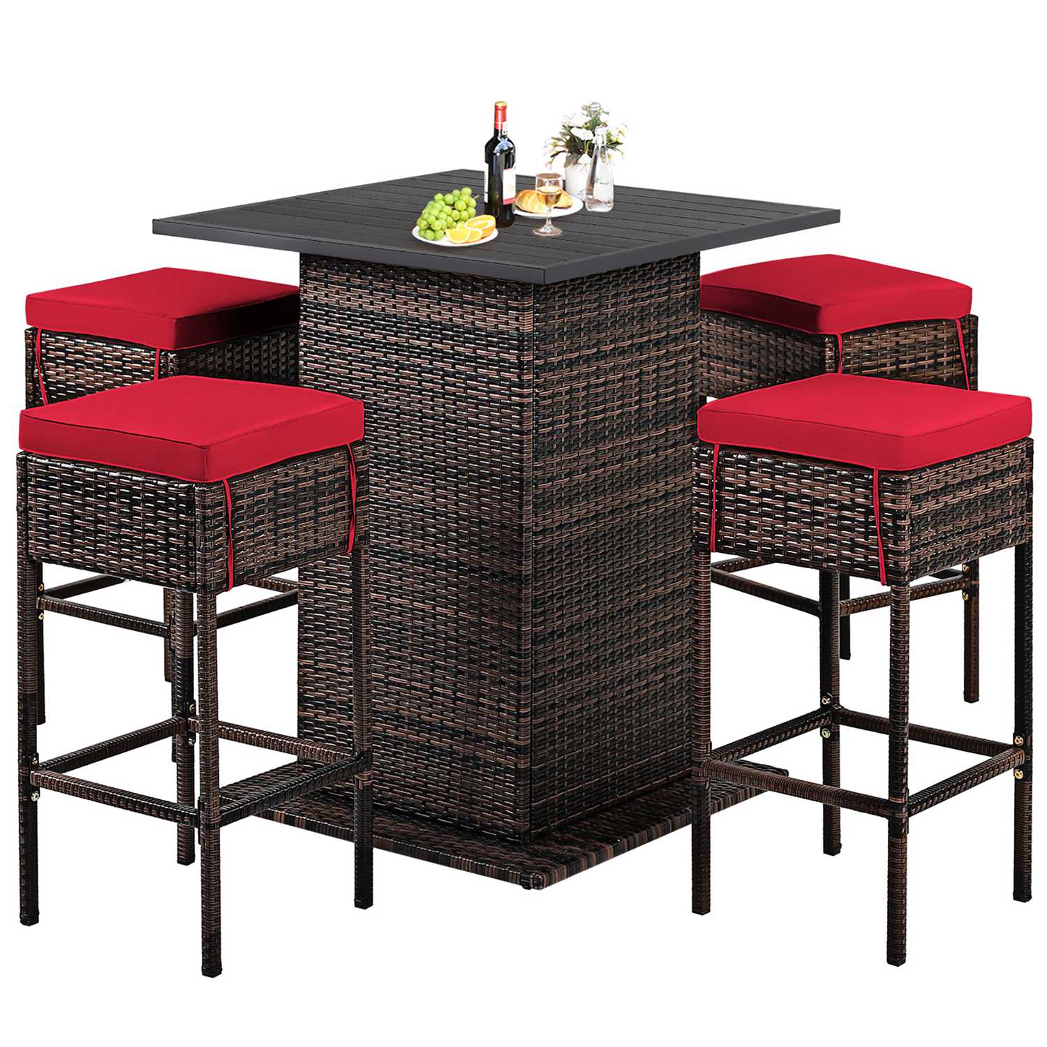 Costway 5PCS Patio Rattan Bar Table Stool Set Hidden Storage Shelf Cushion Red