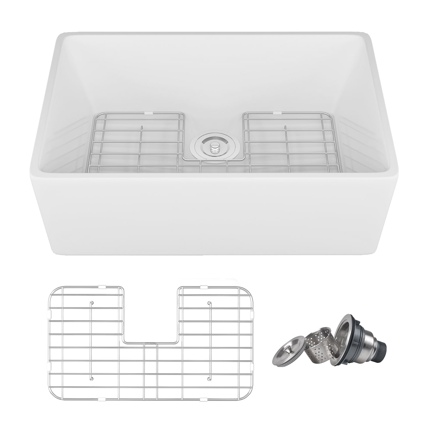 Complete package includes Ceramic Sink, Basket Strainer, and Grid