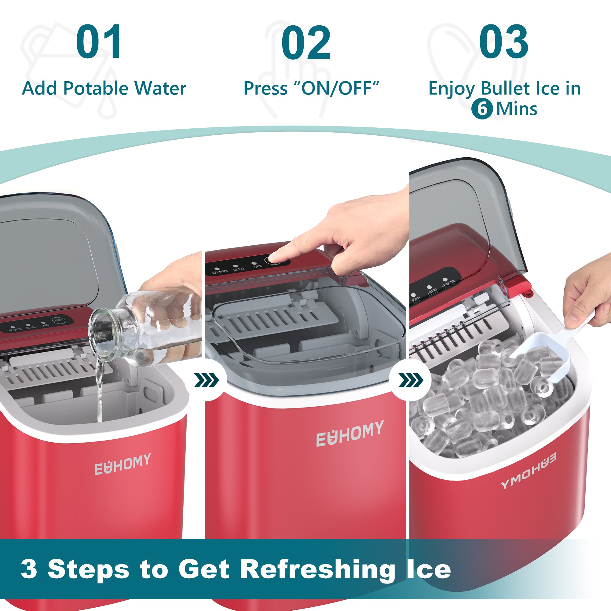 Ice making efficiency, enjoy your first batch of ice in 6 minutes; produce up to 26 lbs in 24 hours to meet your needs.1.2 liter water tank and 1.3 lbs removable basket designed to meet a variety of occasions at once. Bullet ice is dense and melts slowly, keeping drinks cooler longer. Intelligent operation is easy and convenient, one-touch ice making, intelligent reminder of ice full or water shortage. Automatic cleaning system saves time and effort, keeping the refrigerator clean and hygienic. Low noise design, operation noise is less than 45dB. Suitable for home, office, camping, party, bar, RV and other occasions.Feel free to email support@Euhomy.com for any support.We offer you a 1-year limited warranty. If you can give us a good review, we will extend the warranty period to 3 years specifically for you.