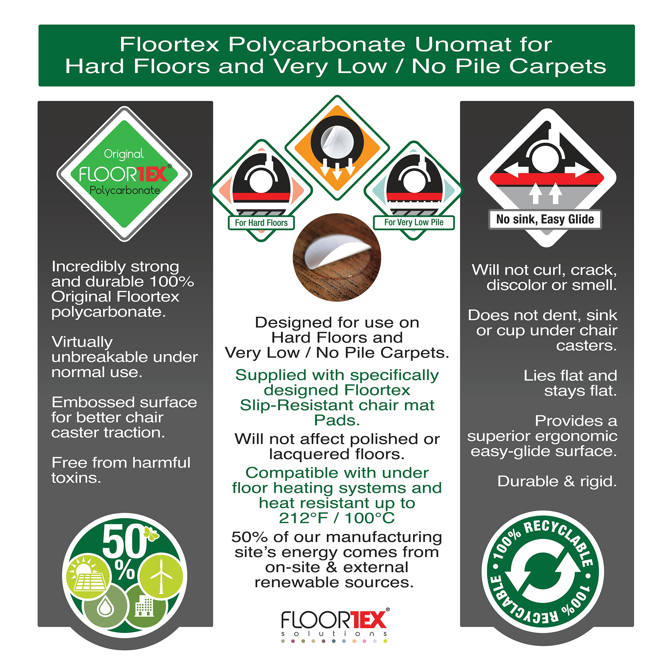 Made from up to 50% recycled eco-friendly enhanced polymer for high impact strength and long-life durability; Provides a perfectly flat and rigid ergonomic easy glide roll surface; Dramatically outperforms and outlasts alternatives manufactured from RPET or PETG plastic; Protects your floors from general wear and damage that can be caused by chair casters