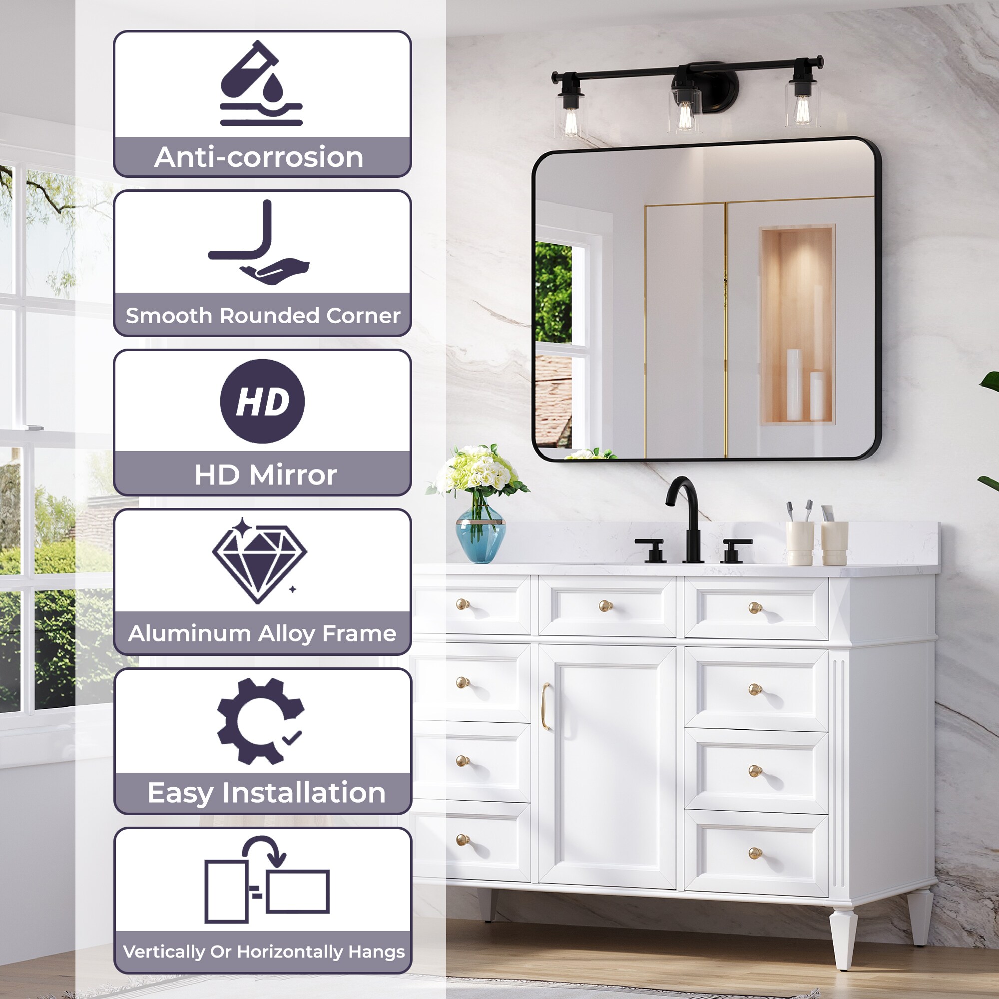 Useable areas and purpose: this wall-mounted mirror can be used in bathroom, bedroom, living room, etc