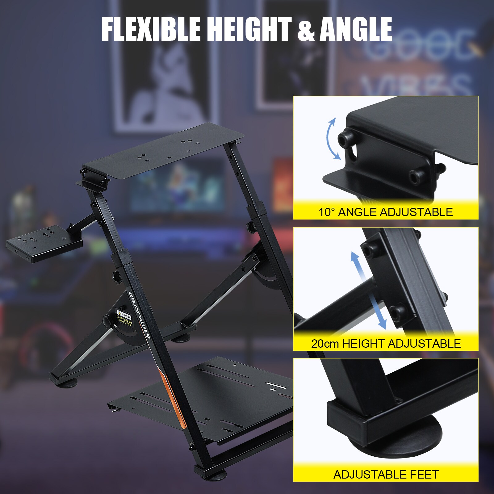 - Steering wheel rack has 20 degree up and down adjustment, the height can be adjusted with a distance of 20CM by rotating the button, which brings the best driving experience to players of different sizes,find your optimal driving posture for comfort and performance