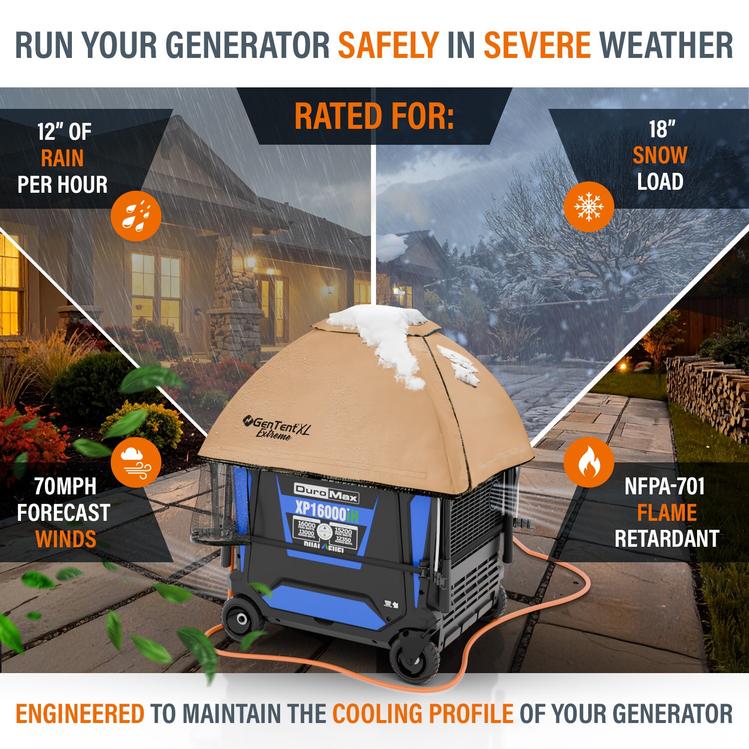 Run your larger fully-encased inverter generator with confidence while maximizing safe usage, even in extreme weather, thanks to the GenTent XL Inverter Generator Tent & Running Cover. Engineered and independently lab-tested, this robust cover is the only one purpose-built for operating larger inverter generators outdoors. It's certified NFPA-701 flame-retardant and made from dual-coated vinyl with welded seams, designed to resist cold-cracking and endure outdoor conditions. You can quickly strap it on, frame it up, and keep it covered with outdoor-grade elastic straps and hook loop fasteners, all without tools. proven to withstand forecast winds up to 70 mph, support 18in of snow load, and handle rain rates of 12in per hour, GenTent lets you safely operate and protect your backup power setup in wet weather. ideal for larger inverter units up to 17,500W, it delivers reliable performance so you can WeatherProof Your Power!