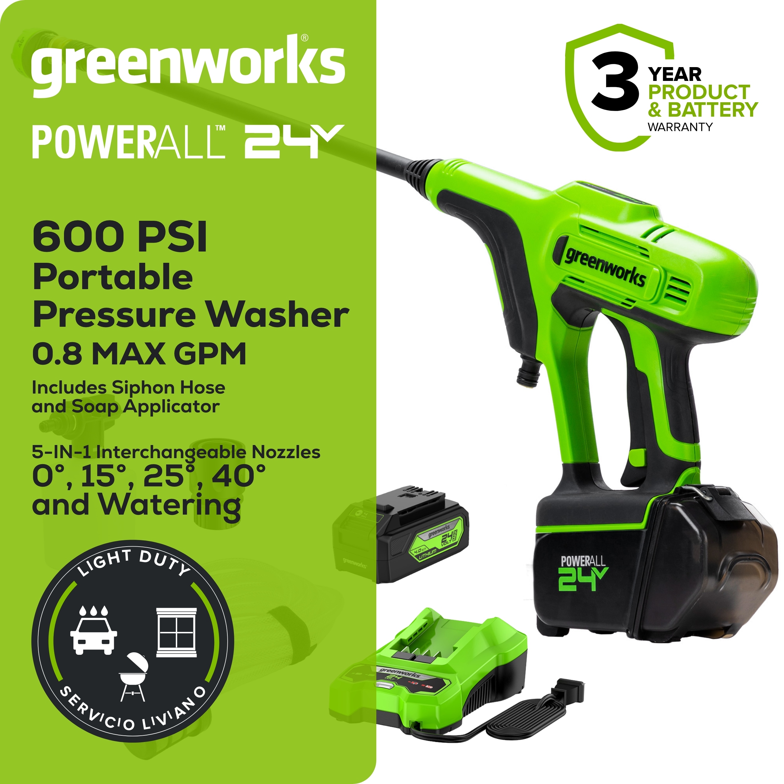 The Greenworks 24V Cordless Power Cleaner is compact, lightweight, and easy-to-use. With 600-PSI at 0.8 GPM, there's plenty of power for cleaning windows, outdoor furniture, cars, boats, campers, and more. It features a versatile 5-in-1 nozzle for cleaning dirt and debris from a variety of surfaces and works with any typical garden hose. When a garden hose spigot isn't available, the 20-ft self-siphoning hose pulls water from any fresh water source. The Greenworks 24V lithium-ion platform powers 125+ indoor and outdoor products, including lawn mowers, blowers, string trimmers, chainsaws, power tools, and more. Backed by a 3-year tool & battery warranty, it's built to last for years to come.
