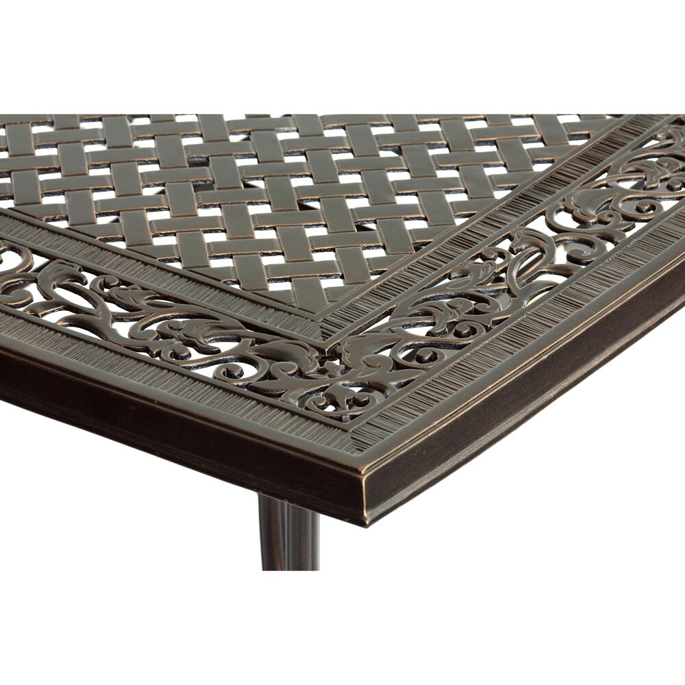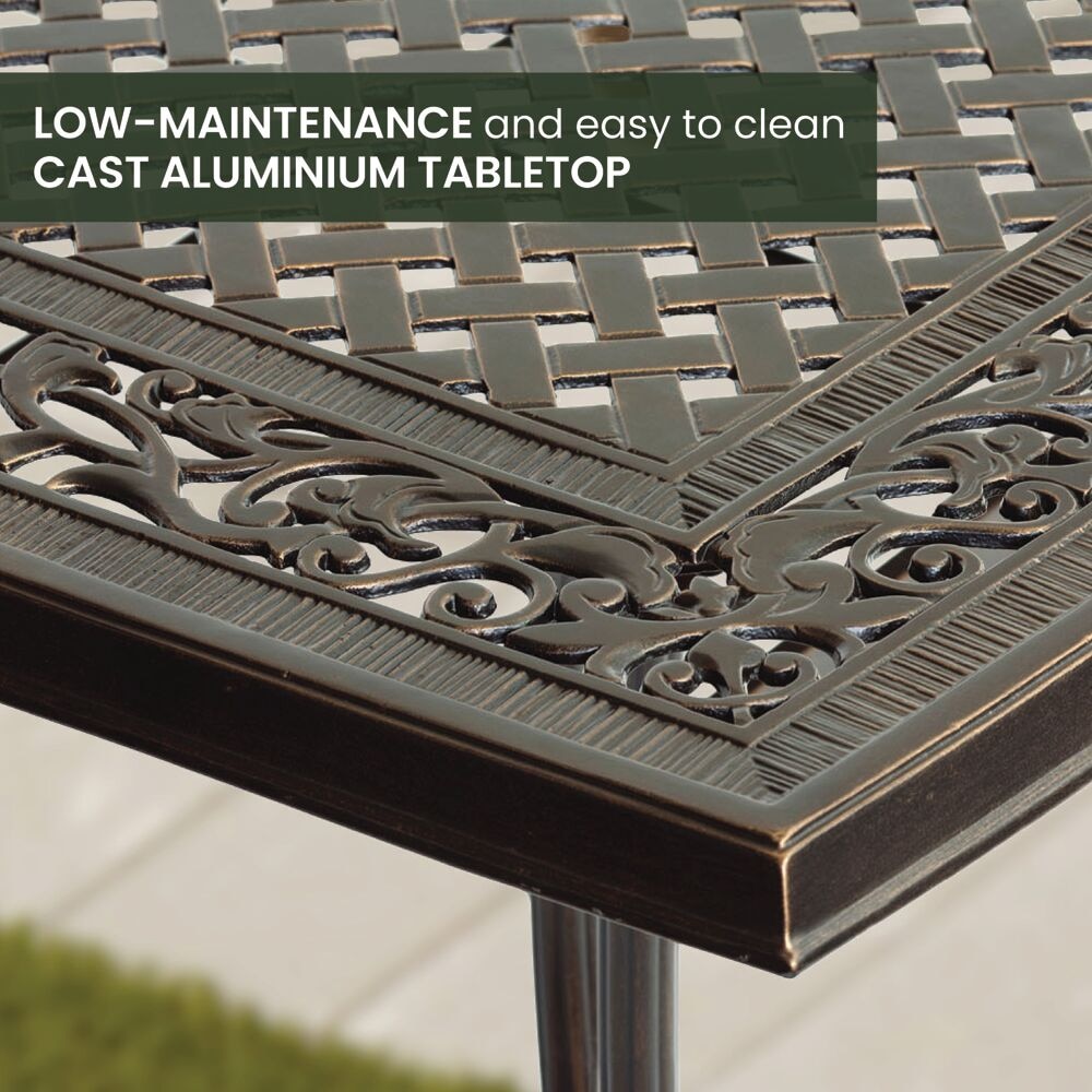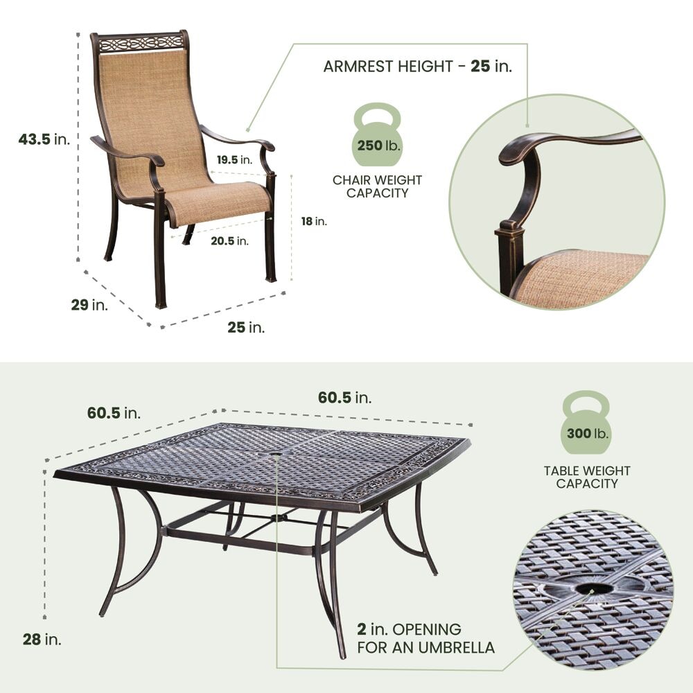 Treat your guests to fine-dining under the stars with the Manor 9-Piece Dining Set by Hanover Outdoor. This quality set includes one large dining table and eight sling-back dining chairs for the ultimate dining experience. Both sophisticated and refined, this set creates an alluring centerpiece in your backyard and adds extra convenience while you’re entertaining guests outdoors. Each chair features tall, contoured seats that provide upper and lower back support as you dine in comfort and style. The massive 60-in. square table is covered with open-lattice accents that swirl across the table-top and chairs. Durable aluminum frames are polished with a protective bronze coating that accentuates any surrounding environment and repels weathering harm. Designed for many years of enjoyment, this outdoor dining set will provide the best space-saving accommodations for those who love to entertain a crowd.