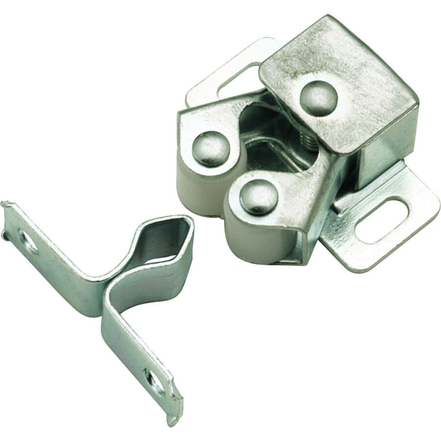 Double-roller cabinet catch, elongated screw holes on case permit easy adjustment self-aligning arms to work independently assuring easy positive action