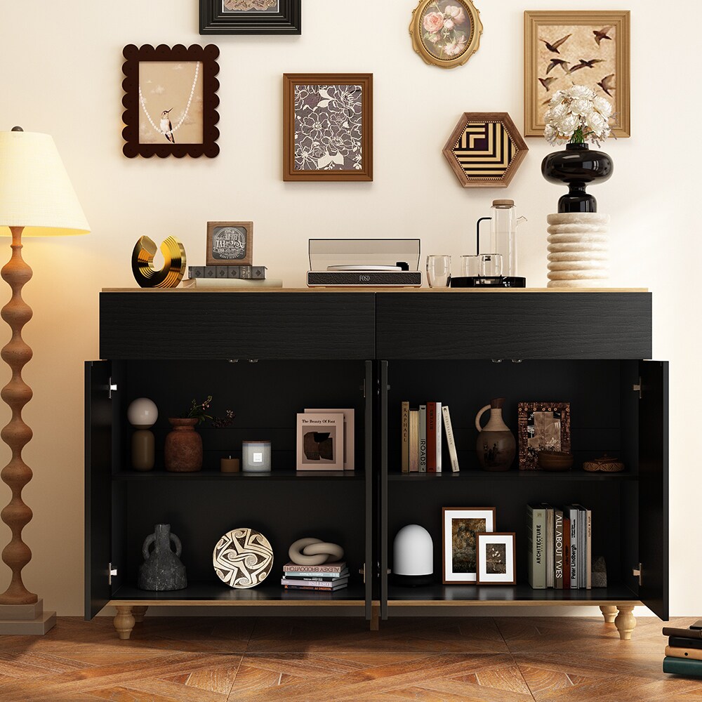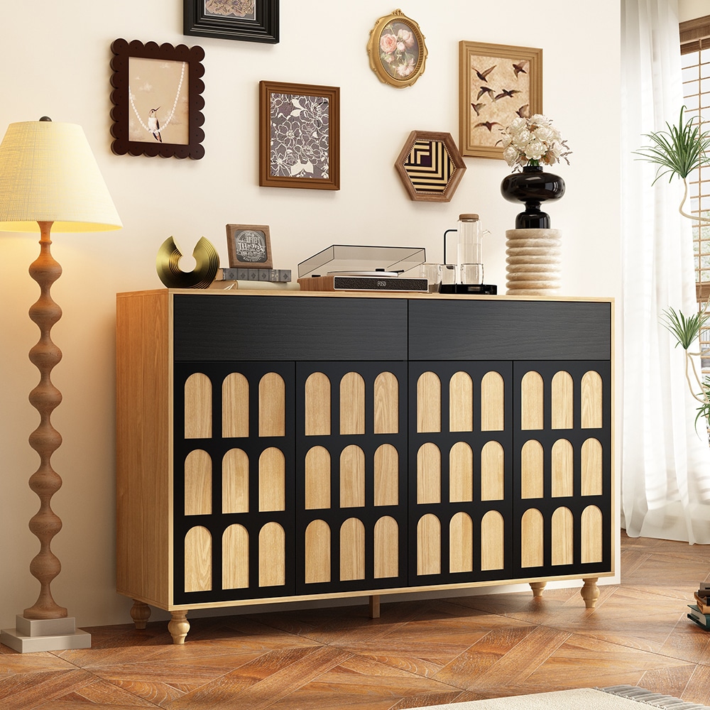 Homsee Black and Brown Wood 59 Inch Sideboard Kitchen Cabinet with Push to Open Doors and Drawers Modern Storage Buffet with Arched Door Design