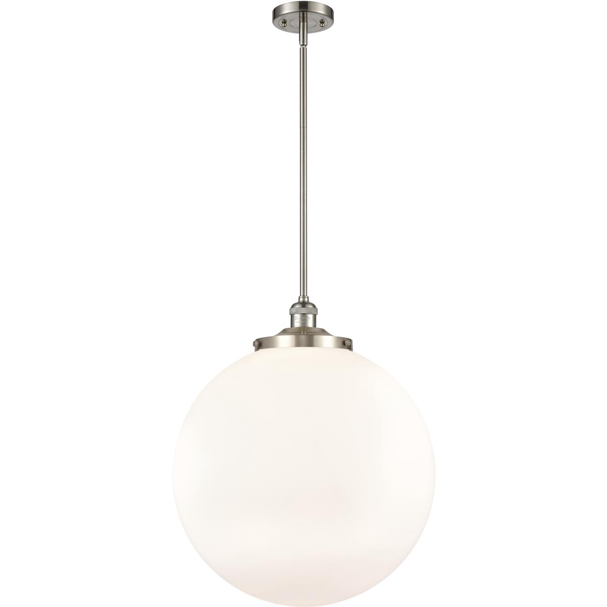 This 1 light Pendant from the Franklin Restoration Beacon collection by Innovations Lighting will enhance your home with a perfect mix of form and function. The features include a Brushed Satin Nickel finish applied by experts. Product Features Include: Brand: Innovations Lighting, Collection: Franklin Restoration Beacon, SKU: 201S-SN-G201-18-LED, UPC: 745684573968, Category: Pendant, Finish: Brushed Satin Nickel, Shade: Matte White Glass, Material: Steel / Cast Brass / Glass, Designer: Bruno Marashlian, Length: 18.00 in., Width: 18.00 in., Height: 19.00 in., Max Height: 52.00 in., Diameter: 18.00 in., Backplate/Canopy Width: 4.50 in., Backplate/Canopy Length: 4.50 in., Backplate/Canopy Thickness: 0.75 in., Weight: 5.00 lb., System: Hardwired, Included Chain/Rods/Cord: Stem (1) 6" (2) 12, Included Lead Wire: 120, Warranty: 2 Year Finish, Lifetime Electrical, Bulbs Included: Yes, Bulb Category: Replaceable LED, Primary Bulb(s): 1 x 100.00 watts E26 ST64, Color Temperature: 2700, Color Rendering Index: 82.0000, Total Lumens: 350, Voltage: 120, Safety Rating: UL/cUL/ETL/cETL Damp, Title 20 Approved