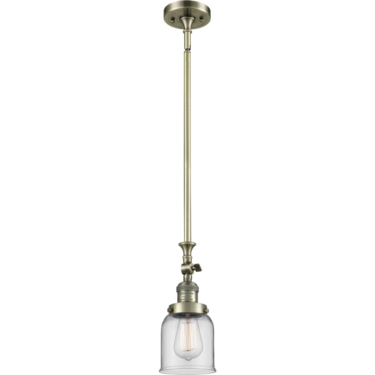 This 1 light Mini Pendant from the Franklin Restoration Bell collection by Innovations Lighting will enhance your home with a perfect mix of form and function. The features include a Antique Brass finish applied by experts. Product Features Include: Brand: Innovations Lighting, Collection: Franklin Restoration Bell, SKU: 206-AB-G52, UPC: 638932458745, Category: Mini Pendant, Finish: Antique Brass, Glass: Clear Small Bell, Shade: Clear Glass, Material: Steel / Cast Brass / Glass, Designer: Bruno Marashlian, Length: 5.00 in., Width: 5.00 in., Height: 11.63 in., Max Height: 44.63 in., Diameter: 5.00 in., Backplate/Canopy Width: 4.50 in., Backplate/Canopy Length: 4.50 in., Backplate/Canopy Thickness: 0.75 in., Weight: 4.35 lb., System: Hardwired, Included Chain/Rods/Cord: Stem (1) 6" (2) 12, Included Lead Wire: 120, Warranty: 2 Year Finish, Lifetime Electrical, Bulbs Included: No, Bulb Category: Incandescent, Primary Bulb(s): 1 x 100.00 watts E26 ST64, Color Temperature: 2200K, Color Rendering Index: 99.9000, Total Lumens: 220, Voltage: 120, Safety Rating: UL/cUL/ETL/cETL Damp, Title 20 Approved