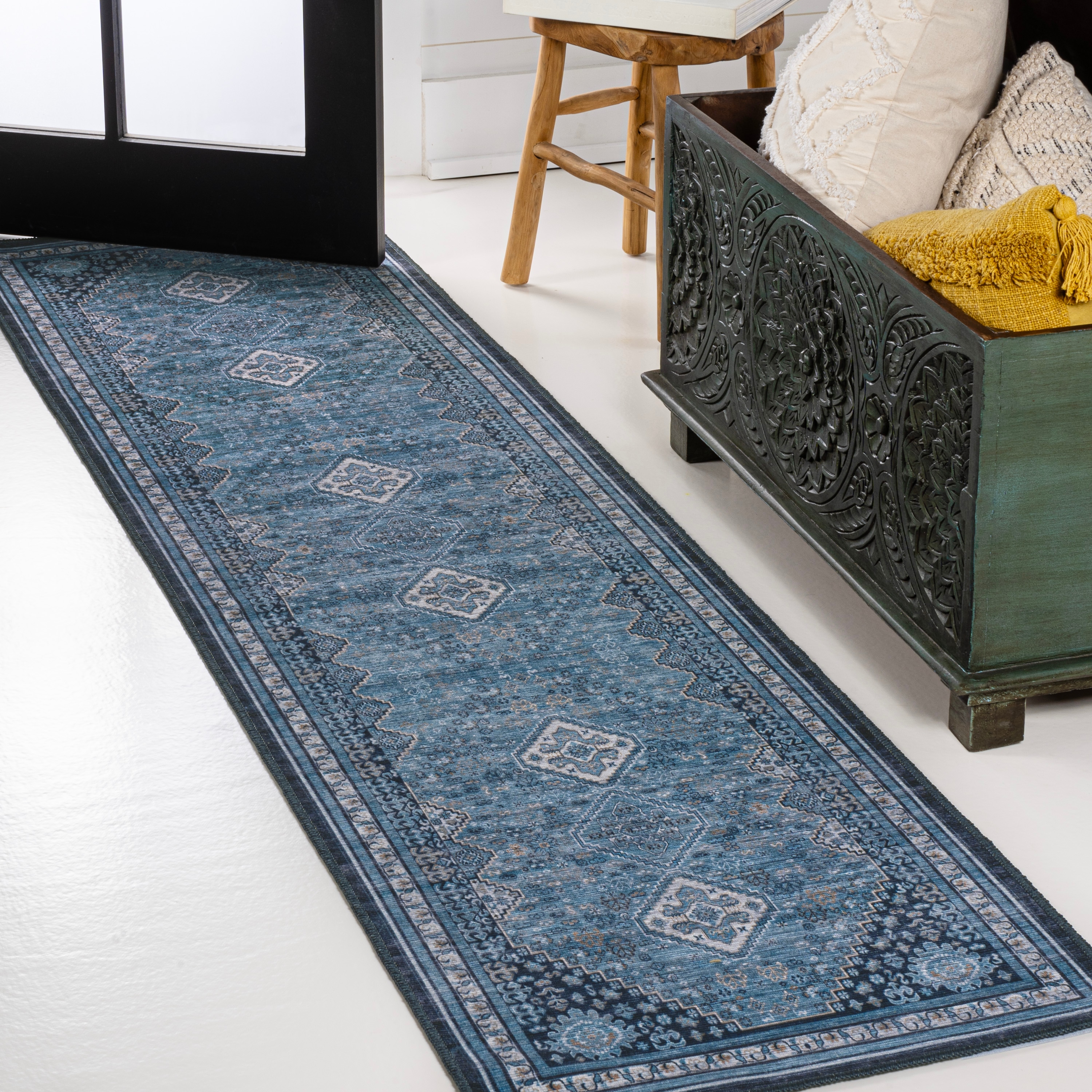 The diamond-shaped medallion in the center of this rug's design recalls vintage geometric rugs. An updated color scheme adds a modern twist to a classic design. With its Bohemian-inspired design this versatile rug would be perfect for a dining room, living room, kitchen, bedroom or porch.