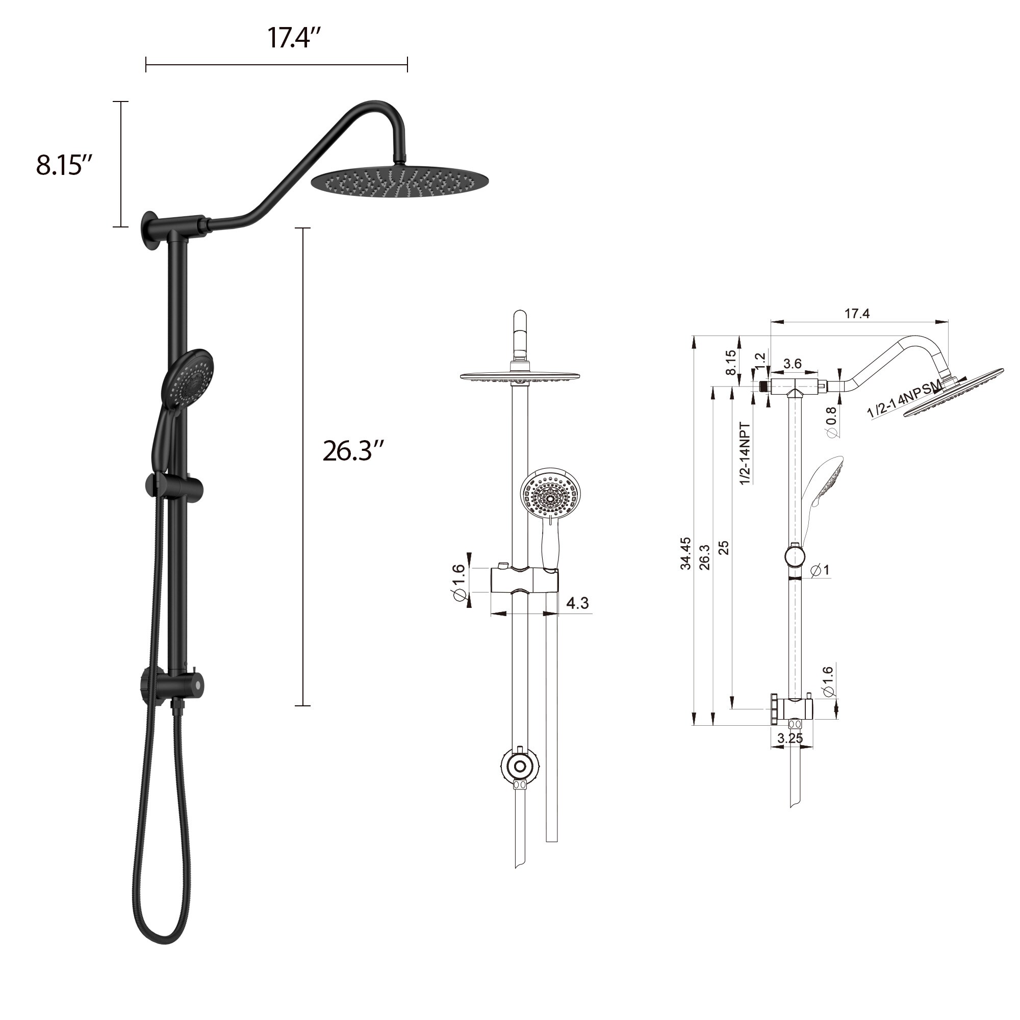 - Shower System Kit: 10-in 304 stainless steel shower head, 17.4-in wall mounted 304 stainless steel shower arm, 4.5-in hand shower head, 25-in stainless steel lift bar, control switch, 59-in stainless steel shower hose, all necessary parts and installation manuals