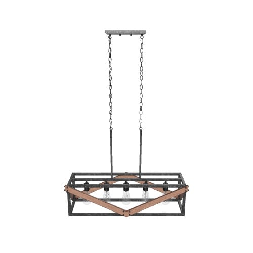 Distressed black and wood tone finish gives this fixture a refined rustic look