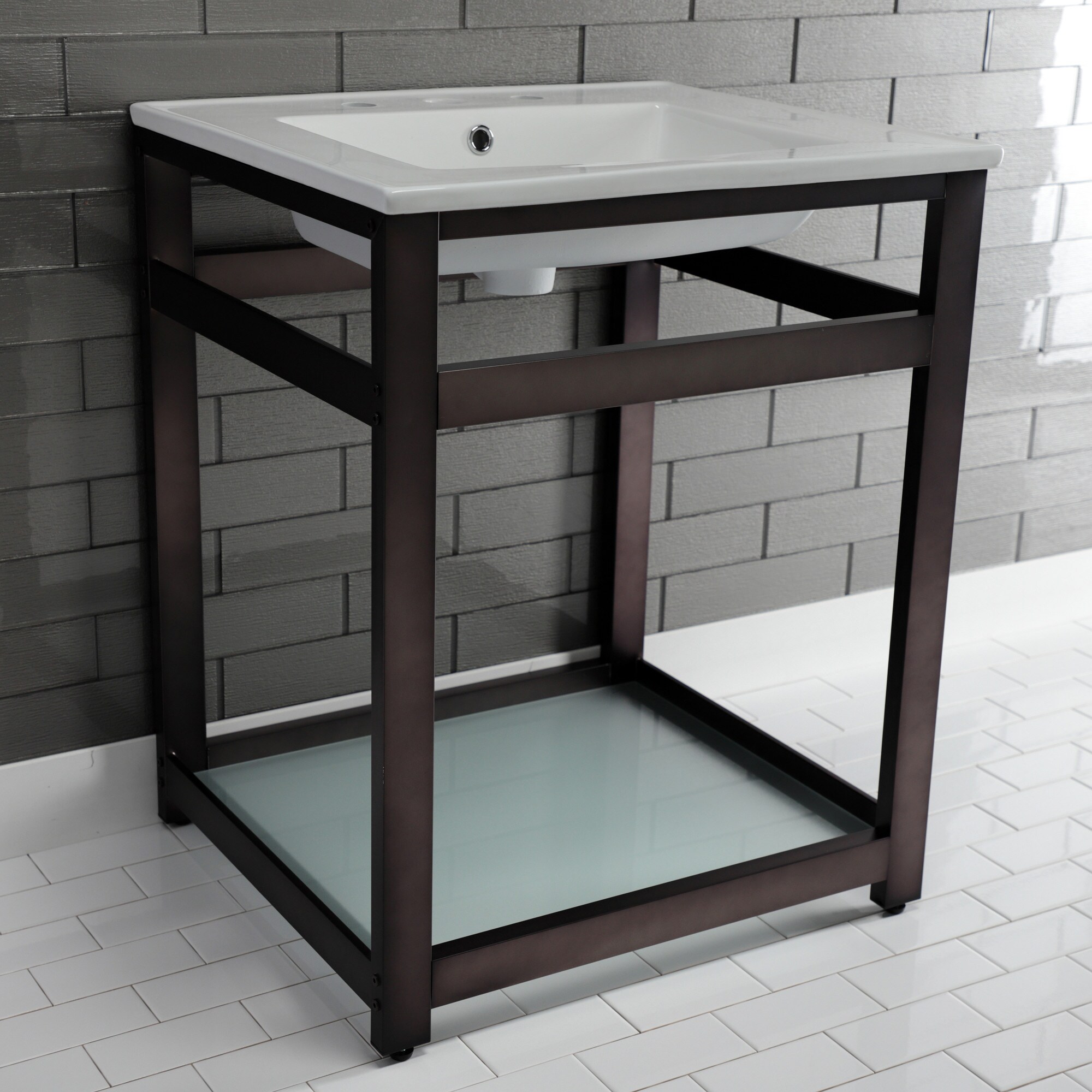 Exquisitely styled for your contemporary taste, this console sink will enhance your bathroom living space. With a beautiful ceramic counter top, this console sink set is a long lasting, durable, and elegant addition to your bathroom. The Kingston Brass 25 in ceramic console sink (8 in, 3-hole) features a wash basin and steel base that is available in a handful of finish options. Their pristine, stain-resistant surface and glistening finish make for a very sturdy fixture that is easily maintained. Additionally, this sink base comes with a glass shelf for added functionality and aesthetic appeal. Water supply kit, drain assembly, and the faucet are sold separately.