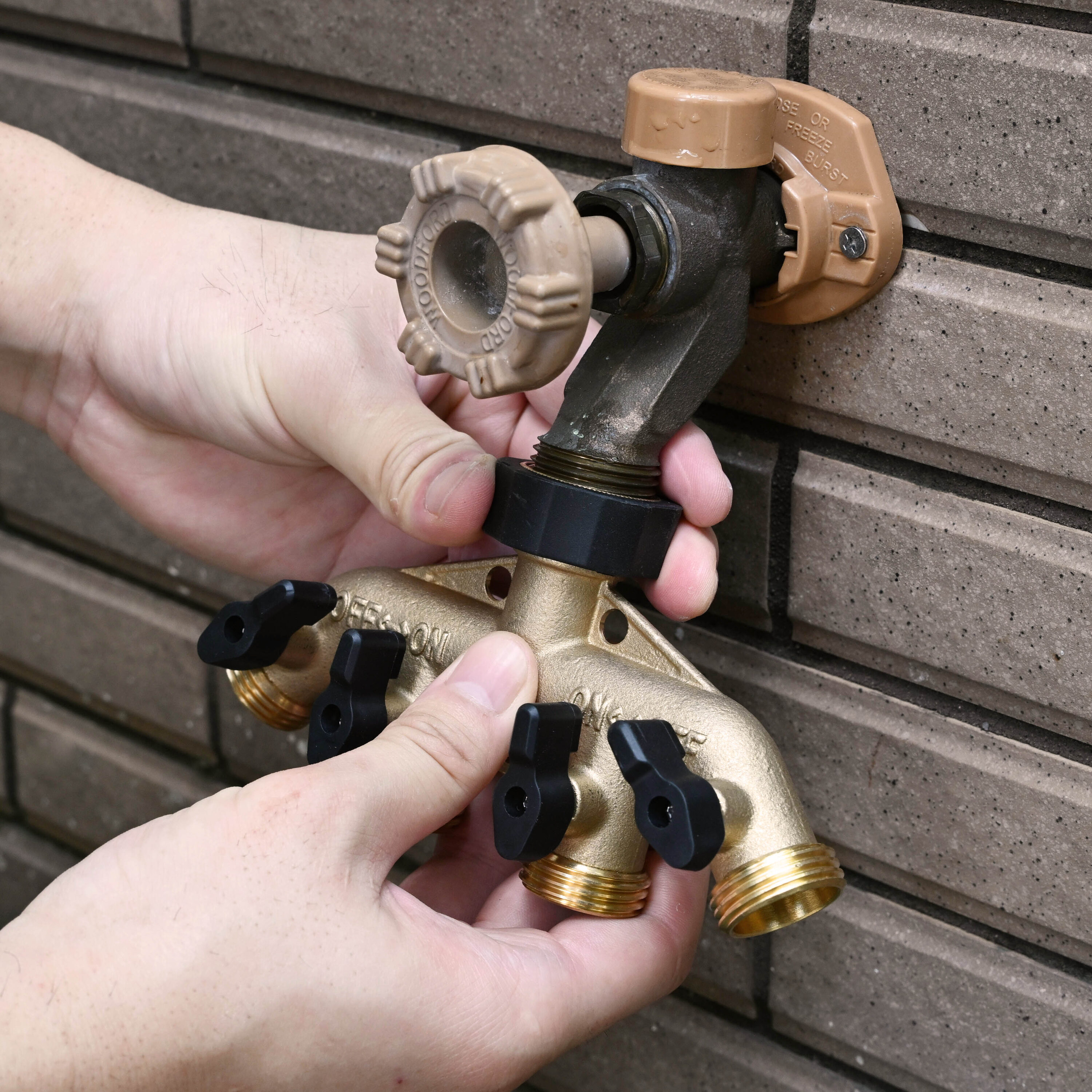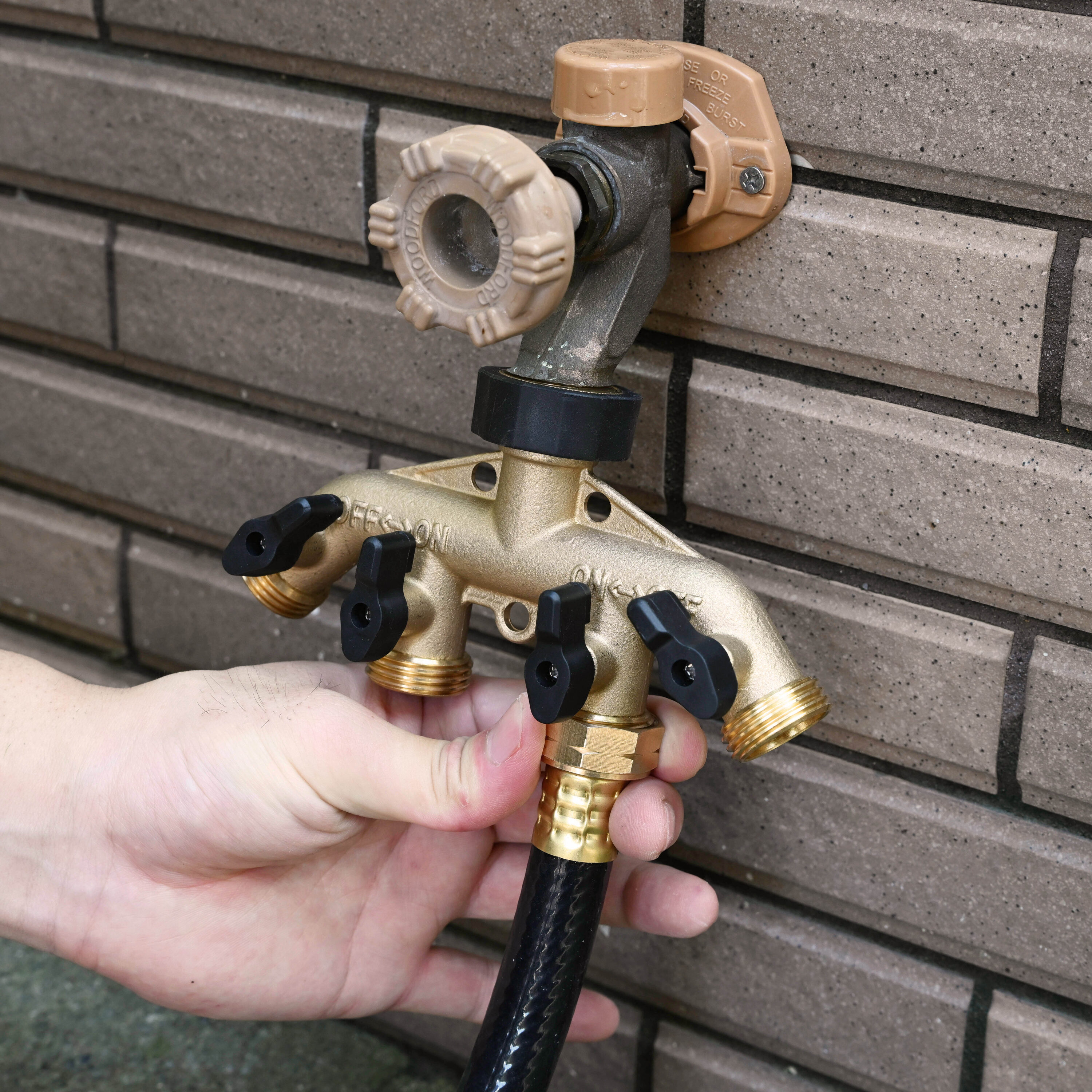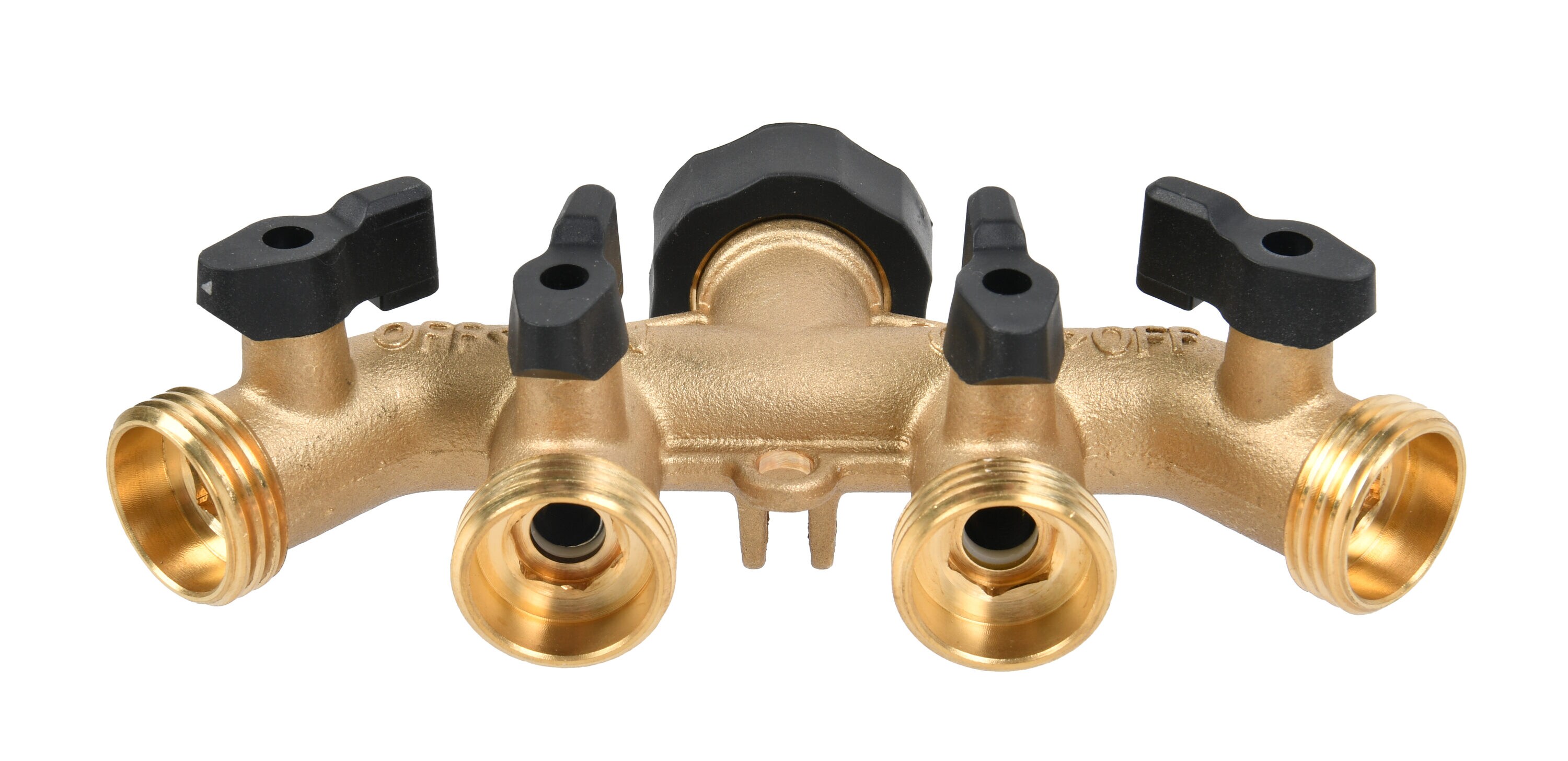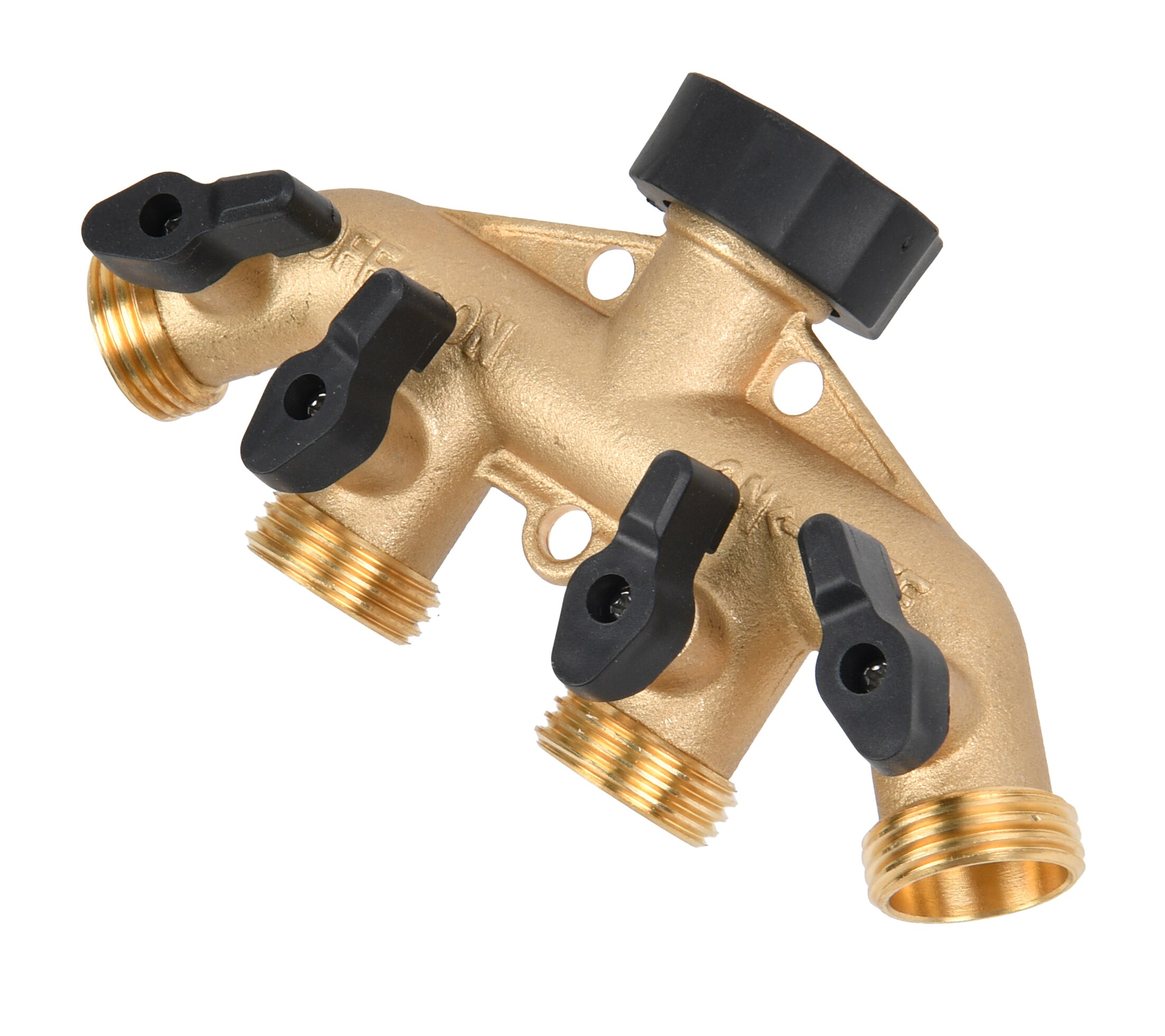 Two hoses are better than one... but four hoses, now that's just awesome! Turn your single water source into four with the 4-way manifold. The valves allow you to control water flow from 4 different sources. Extra large swivel nuts provide easy grip and turn. Large internal ball valves ensure leak proof seal when closed. Easy-on swivel connector assures complete and accurate connection to water source. Designed with heavy-duty brass construction for extra strength, durability and longevity. This shut off connector allows you to have complete control of your water flow and watering source. Attach four different hose attachments and increase your efficiency and convenience. The 4-way manifold is the perfect watering solution for your lawn and garden.