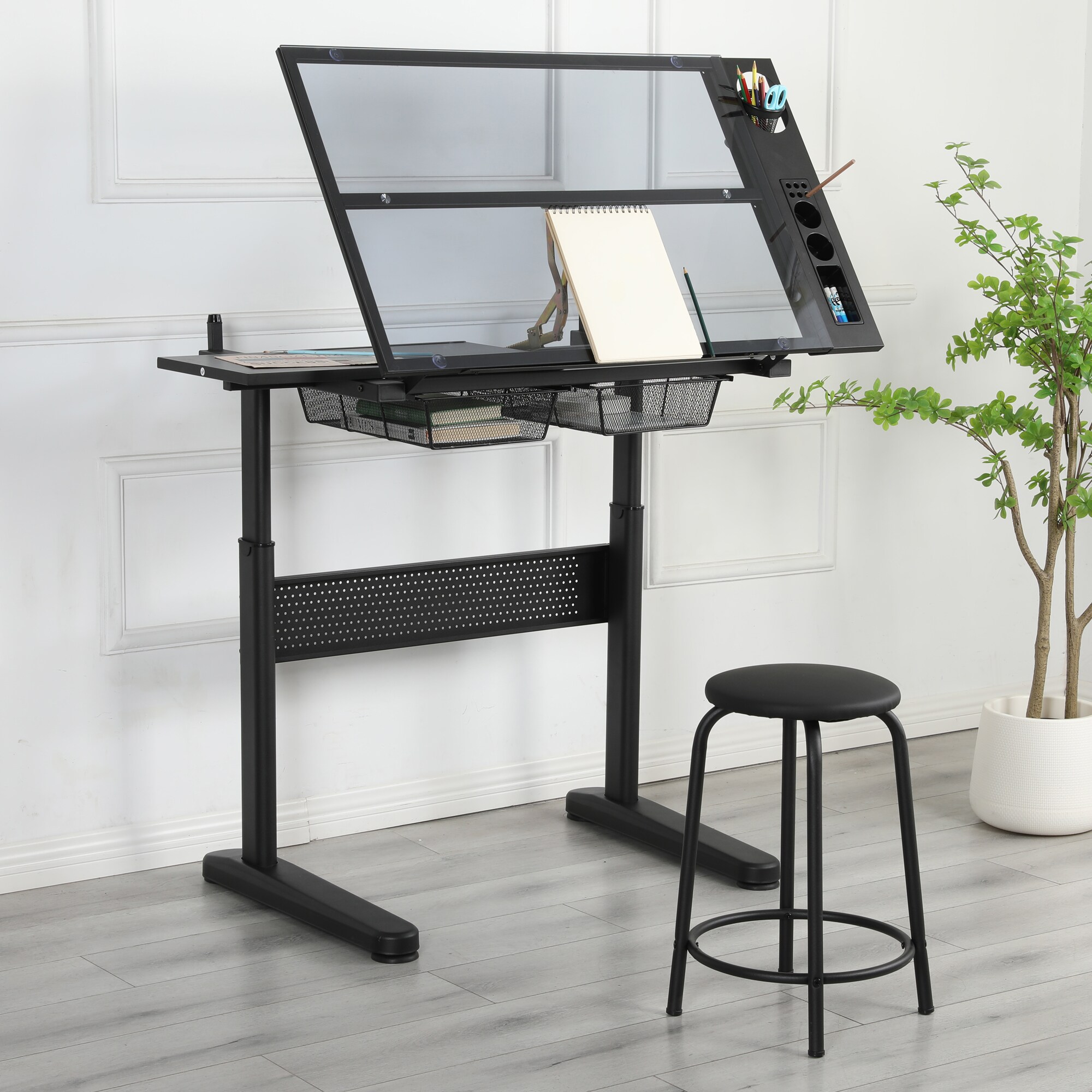 LOVMOR hand crank adjustable drafting table drawing desk with 2 metal drawers WITH STOOL