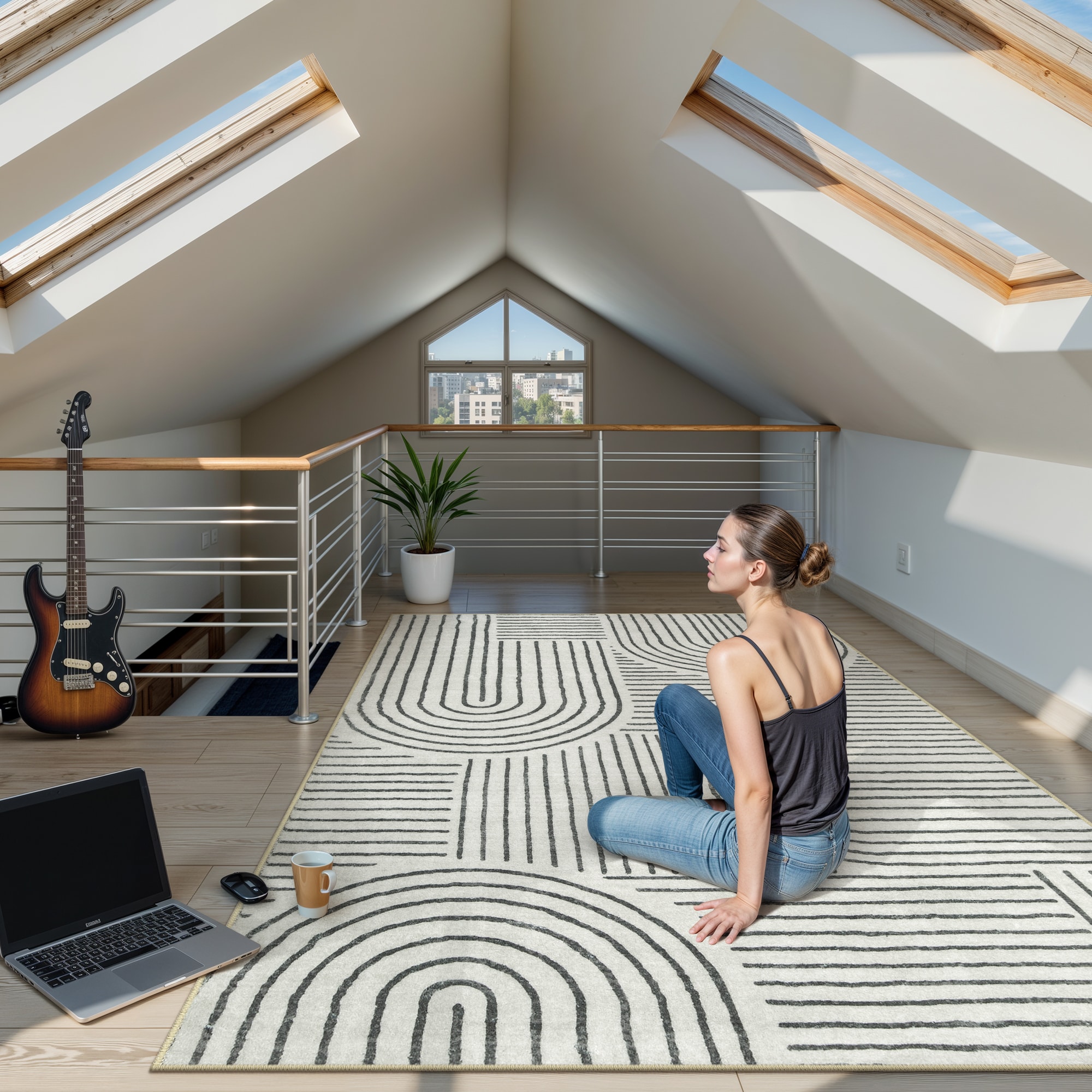 Lahome 6 x 9 (ft) Black Abstract Rainbow Lines Short Pile Velvet Rectangular Indoor Area Rug
