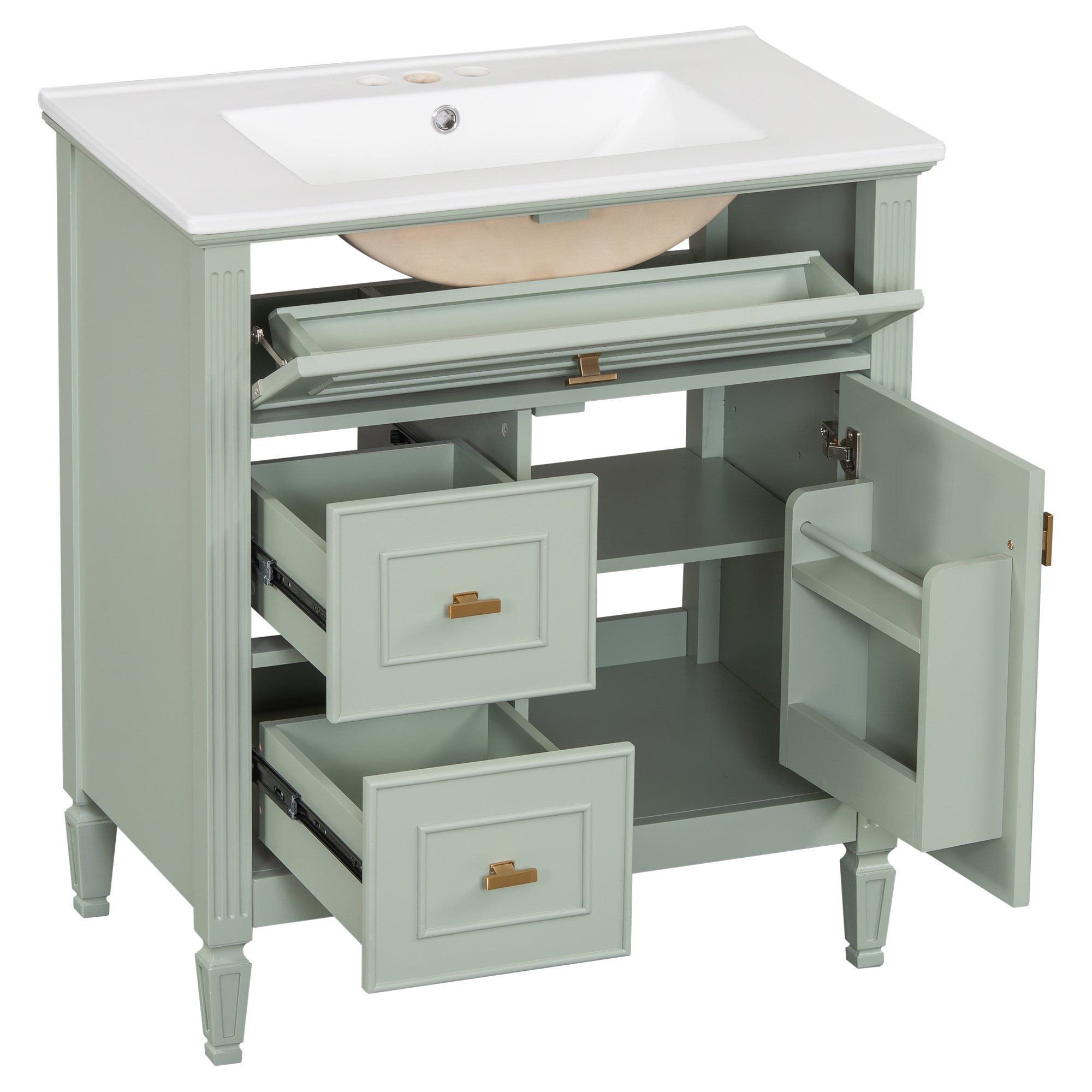 Ample and Secure Storage Space: This bathroom vanity offers plenty of enclosed storage options, including a spacious cabinet with a door, a lift-up drawer, and two large side drawers; Perfect for neatly organizing all your bathroom essentials—soap, towels, shampoo, and more—while keeping them protected from dust and splash-proof;