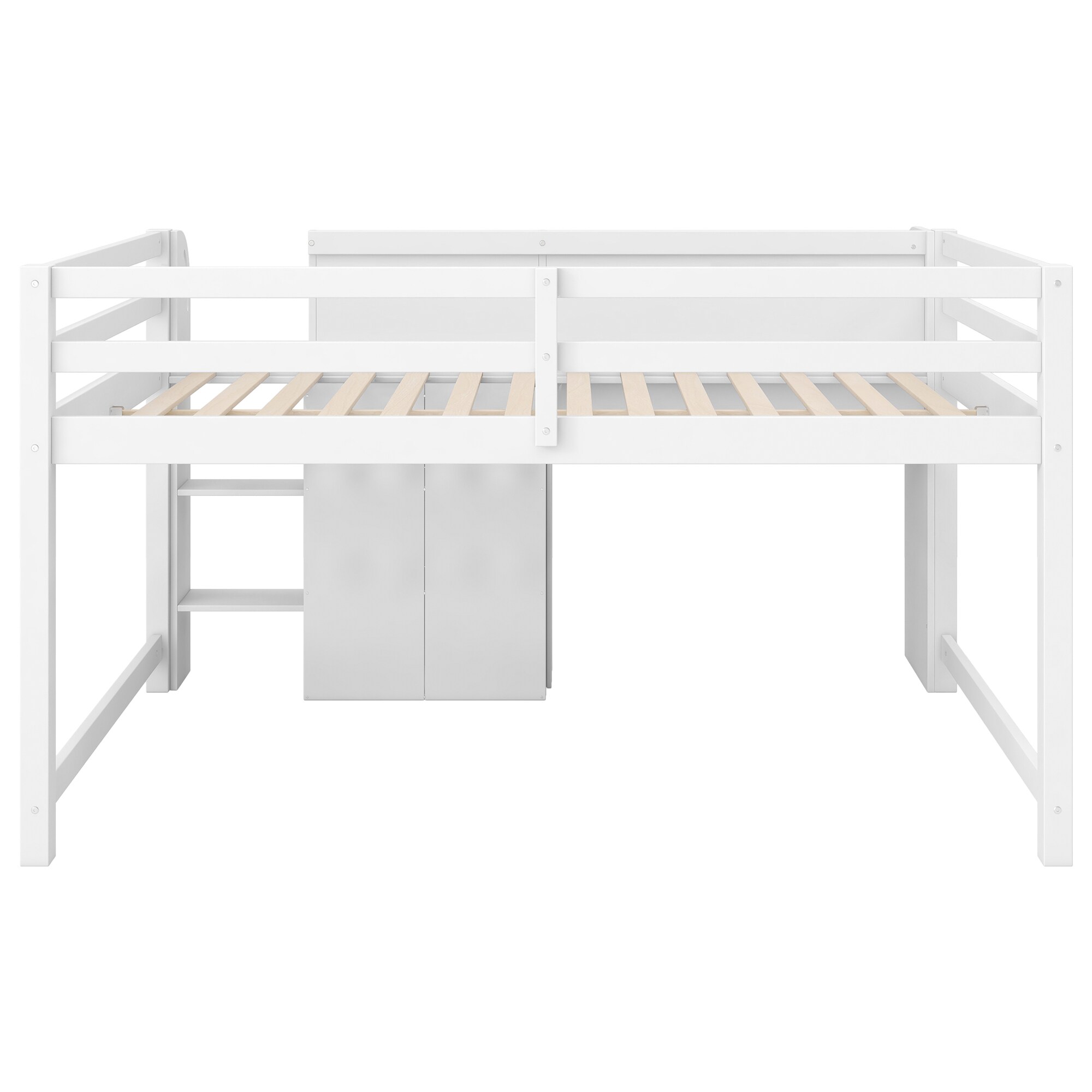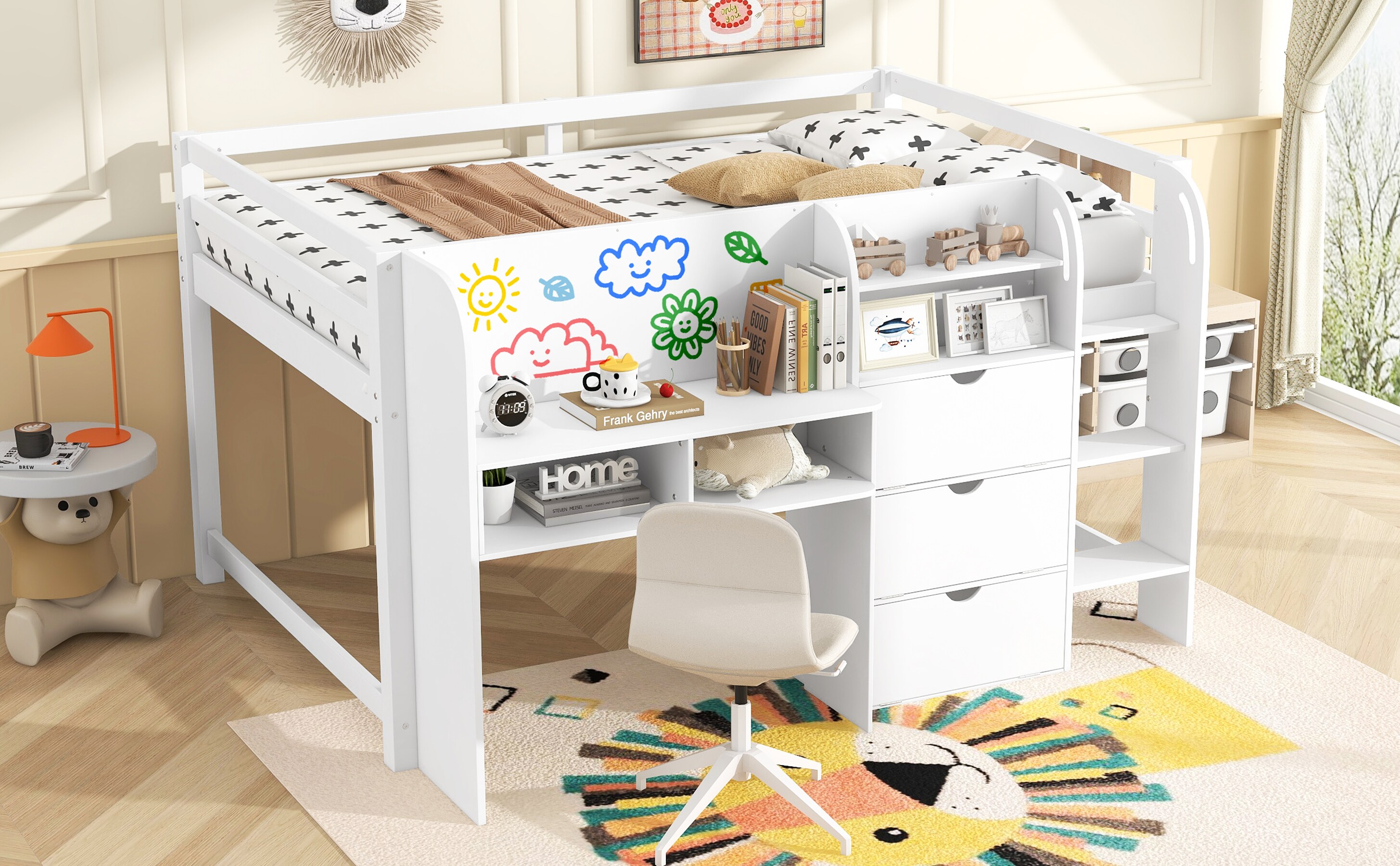 ModernLuxe Full Size Low Loft Bed with Builtin DeskStorage Cabinets and Open BookcaseWhiteboard for GraffitiWhite