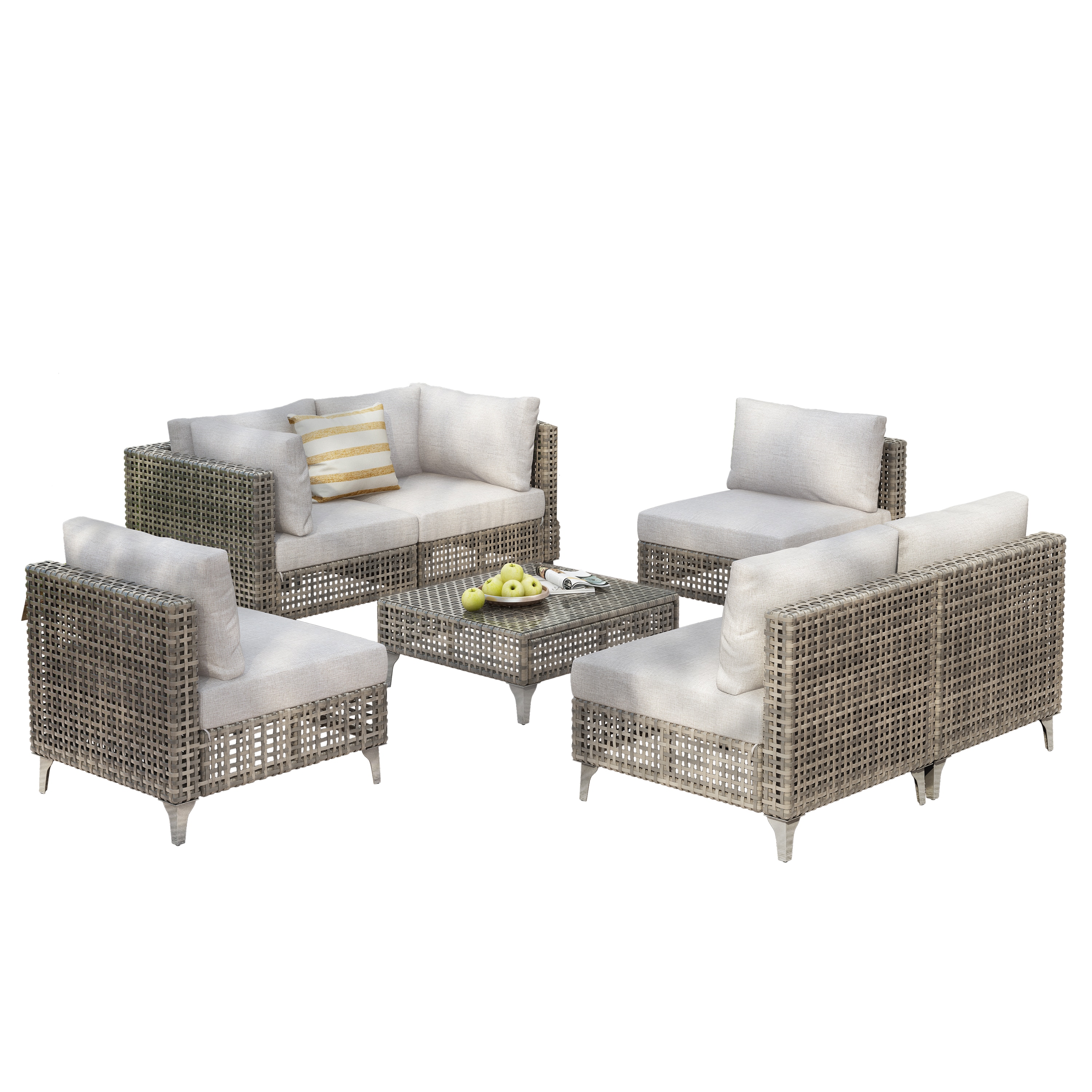 - Includes 4 armless sofas, 1 left sofa, 1 right sofa, and 1 coffee table.