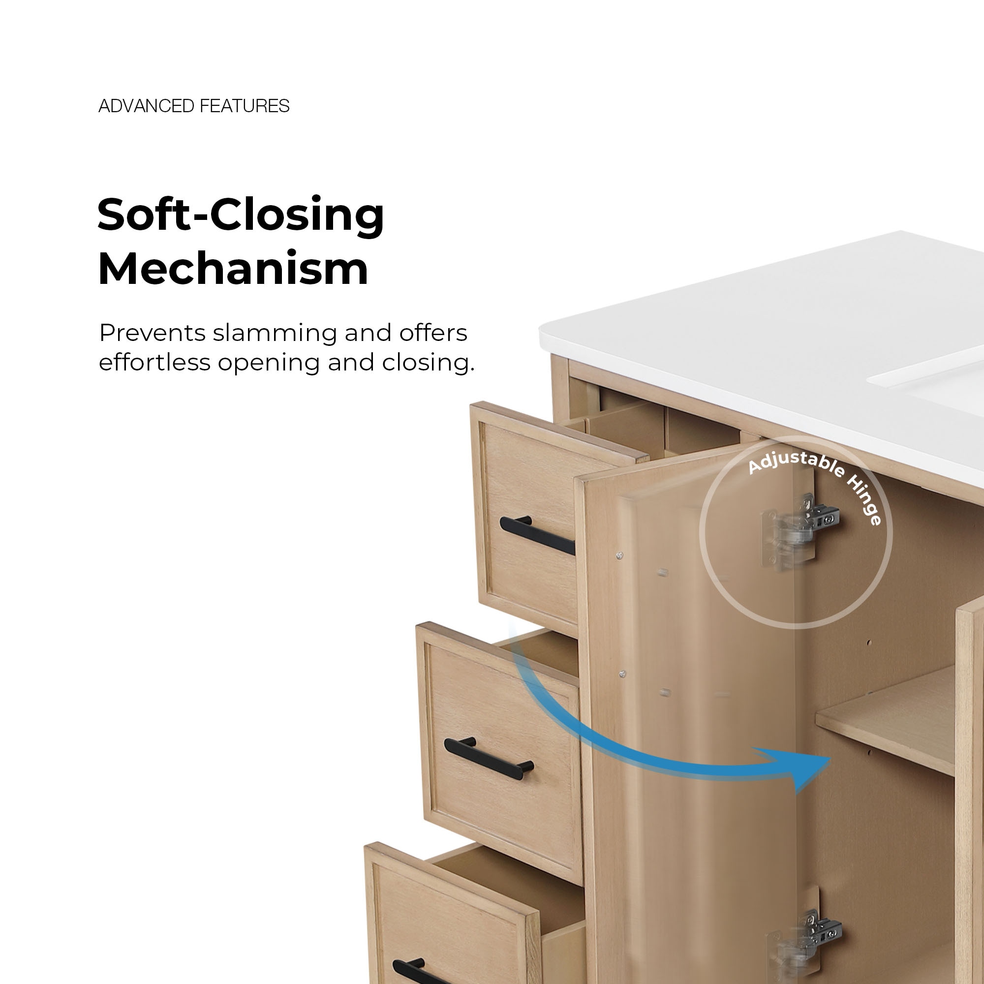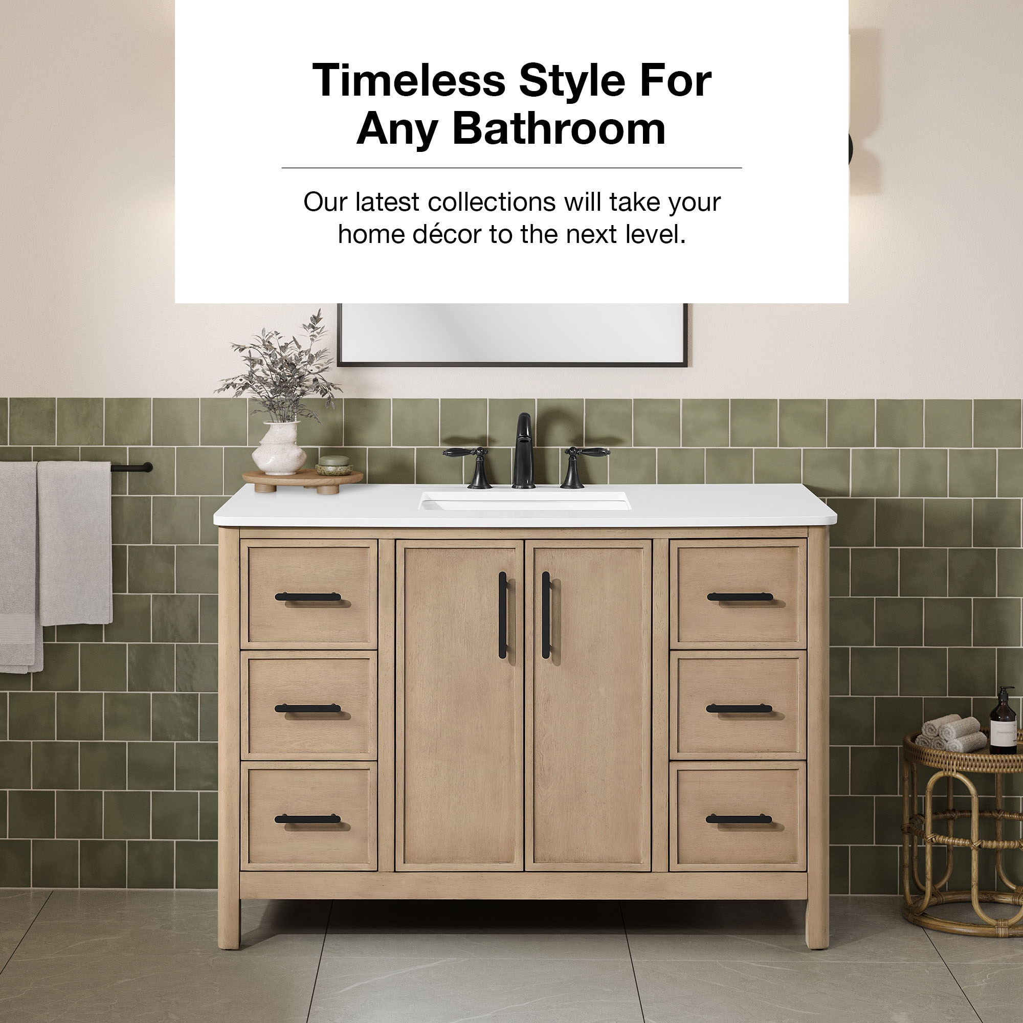 Designed with slim shaker detailing and rounded corners for a modern twist, the Solas vanity by OVE delivers transitional style to any bathroom space. Punctuated by included matte black hardware, its beautiful Sahara Birch cabinet sits in bold contrast with a white engineered stone top. Without sacrificing style, enjoy ample storage thanks to a 2-door cabinet with adjustable interior shelving, 4 regular drawers and 2 divided drawers that work together to keep your bathroom tidy and organized. Ideal for your main bathroom or guest bath, this vanity will bring a fresh update to any space.