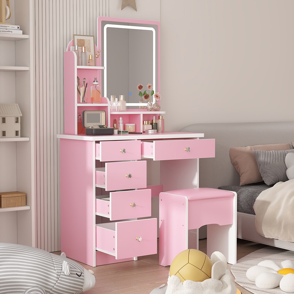 Add charm and functionality to your bedroom with this Pink LED Lighted Mirror Vanity Desk Set with Cushioned Stool and Storage Drawers, designed for comfort, style, and organization. The matching stool features a microfiber leather seat with an elastic cushion for extra comfort, while the large mirror offers 3 adjustable LED light modes—cool white, warm yellow, and natural light—with touch control and gradual brightness adjustment, ensuring the perfect lighting for makeup application. Finished in a chic pink and white design with rounded corners and crystal drawer knobs, this vanity desk brings elegance to any space. With 3 desktop shelves and 5 spacious drawers, it provides ample storage for cosmetics, skincare, and accessories, keeping everything neatly organized. Easy to assemble with included hardware and instructions, this vanity set is a stylish and practical addition to any modern bedroom.